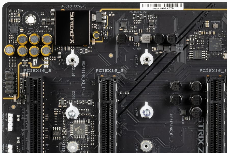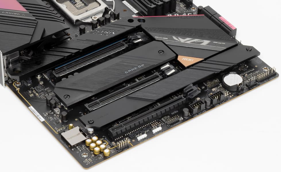 Как я уже упоминал ранее, M.2 слоты также имеют радиаторы: у верхнего и среднего — свои персональные радиаторы, у двух нижних — общий.