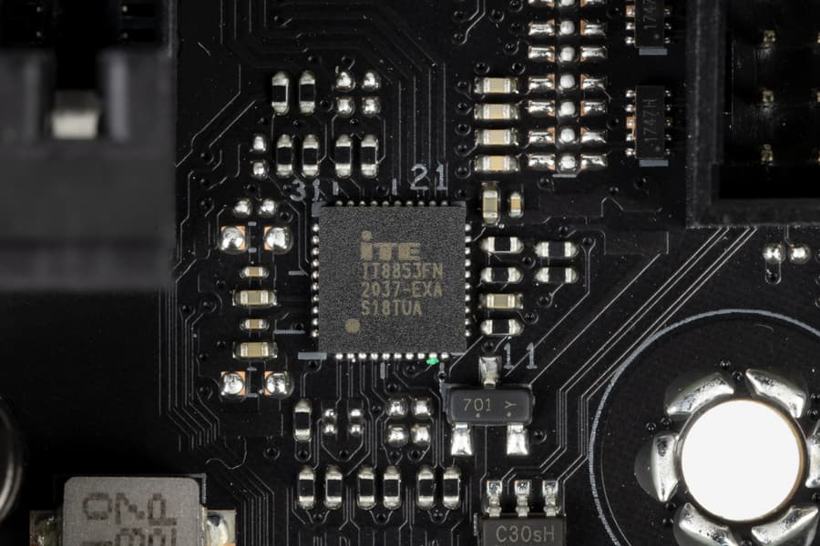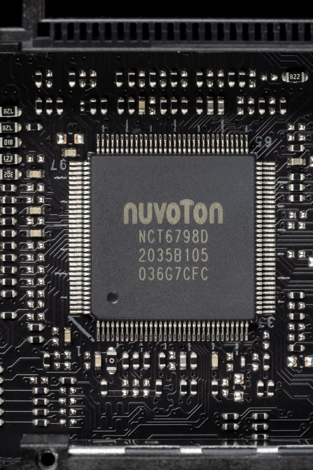 За мониторинг состояния платы отвечает, а также контролирует работу всех гнезд СО (а также в целом Multi I/O) контроллер Nuvoton NCT6798D.