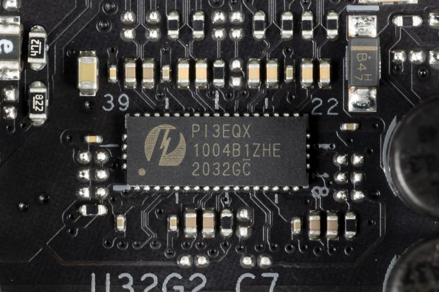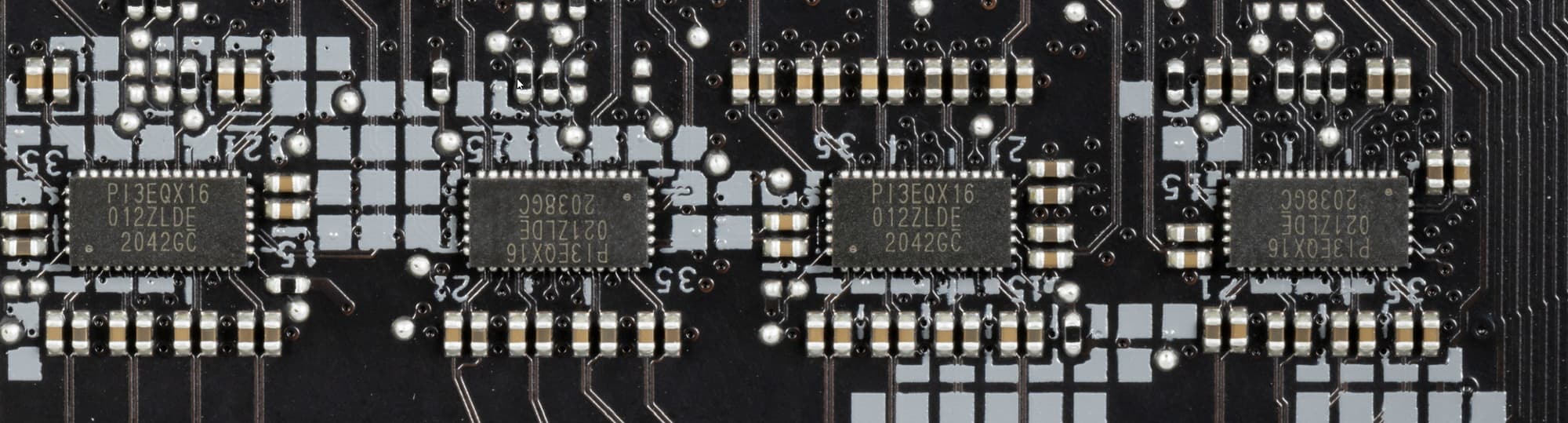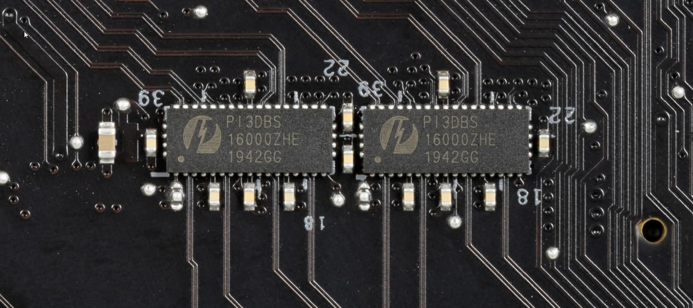 Как видим, перераспределение линий PCIe между слотами у этой материнки имеется, поэтому востребованы мультиплексоры PI3EQX16 от Diodes Inc. (ex Pericom).