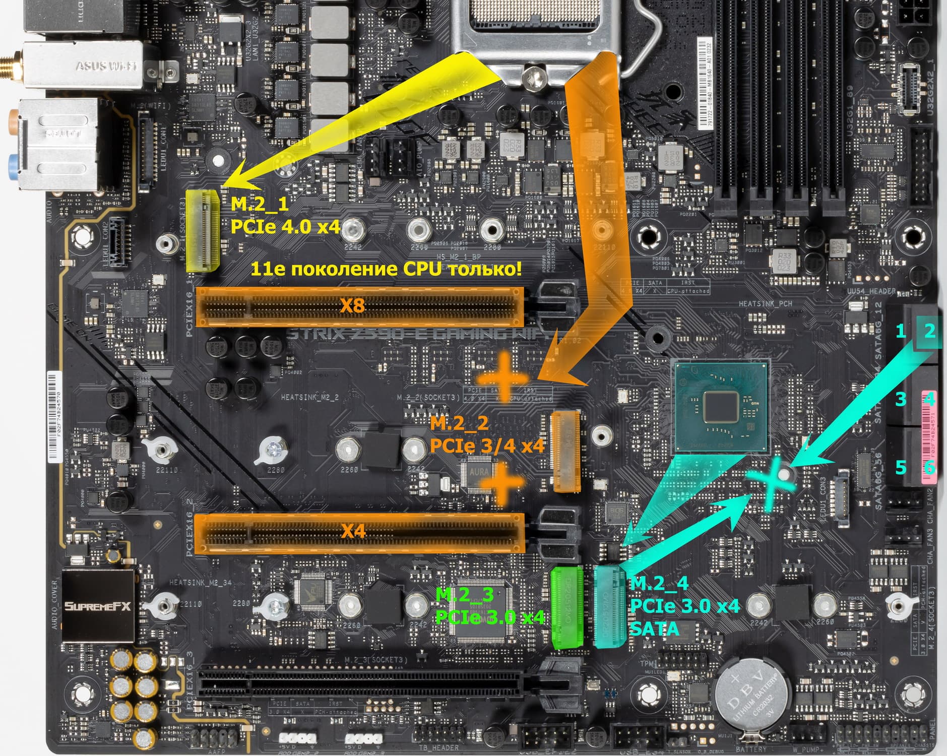 - Переключатель: или порт SATA_2, или слот M.2_4 (4 линии): максимум 4 линии;