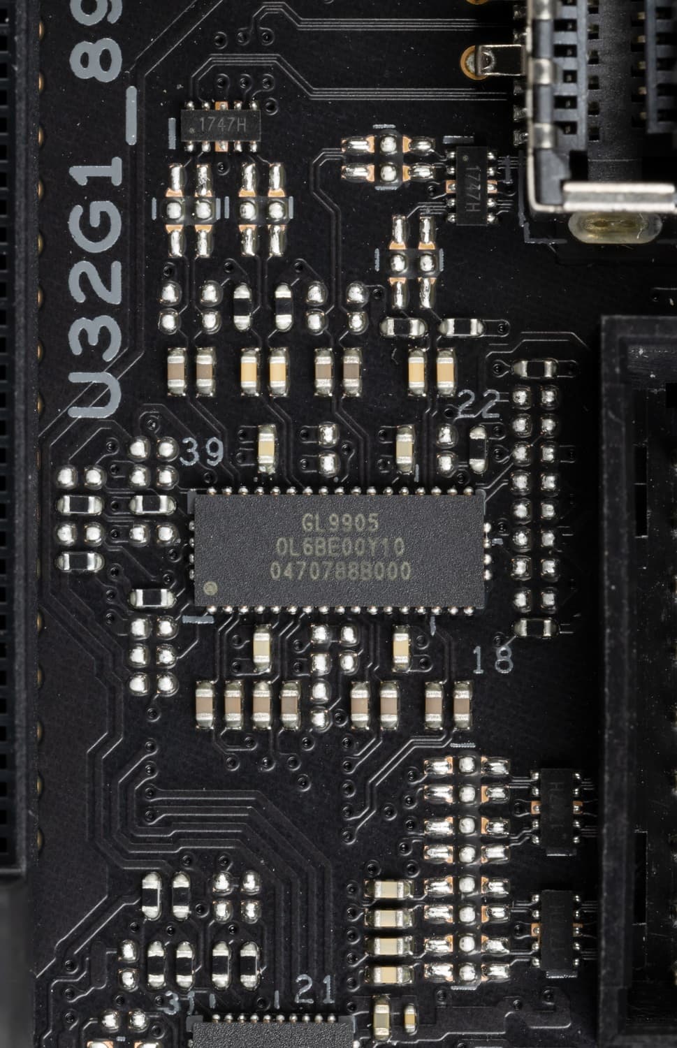 - 2 порта USB 3.2 Gen2x2: один реализован с помощью Z590 (на это ушел 1 USB 3.2 Gen2) и двух «помощников»: хаба ITE IT8853 (который образует USB 3.2 Gen1) и усилителя Genesys Logic GL9905 (который преобразует сие в USB 3.2 Gen2) и представлен внутренним портом Type-C (для подключения к соответствующему разъему на передней панели корпуса); второй также реализован с помощью Z590 (на это ушел один 1 USB 3.2 Gen2) и также двух «помощников»: хаба Genesys Logic GL9901 (который образует USB 3.2 Gen1) и усилителя Genesys Logic GL9905 (который преобразует сие в USB 3.2 Gen2) и представлен портом Type-C на задней панели;