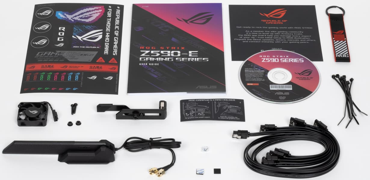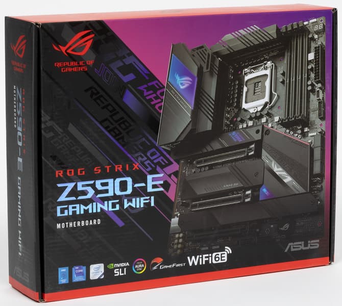 Asus ROG Strix Z590-E Gaming WiFi поставляется в традиционной коробке фирменного дизайна серии ROG. Комплект размещен под платой в отдельном отсеке.