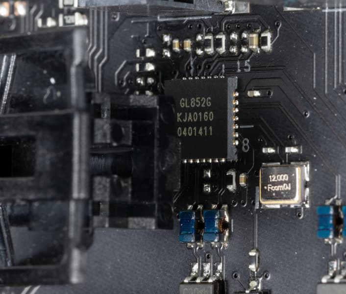 - 6 портов USB 2.0/1.1: 4 реализованы через контроллер Genesys Logic GL852G (на него потрачена 1 линия USB 2.0) и представлены двумя внутренними разъемами (каждый на 2 порта), еще 2 реализованы через Z590 и представлены на задней панели портами Type-A (черного цвета).