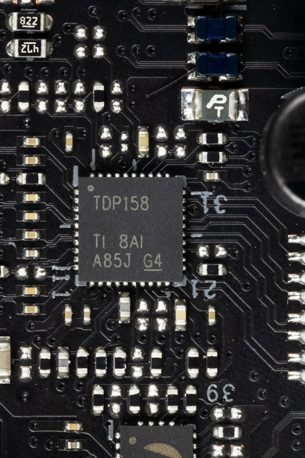 Поскольку процессоры Intel могут иметь интегрированную графику, то плата имеет два гнезда вывода: HDMI и DP. При этом, если графика в 11м поколении процессоров Intel основана на новой архитектуре и имеет встроенную поддержку версии HDMI 2.0b, то в 10м поколении — интегрирована поддержка лишь версии 1.4. Поэтому для конвертации (усиления, так сказать) версии до 2.0b имеется особый контроллер TDP158 (Texas Instruments),