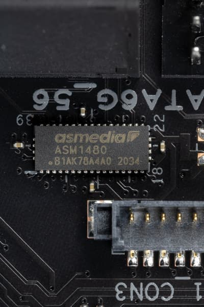 А переключением линий между слотом PCIe x16_3 и портами SATA занимается мультиплексор ASM1480 от ASMedia.
