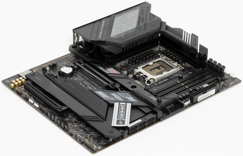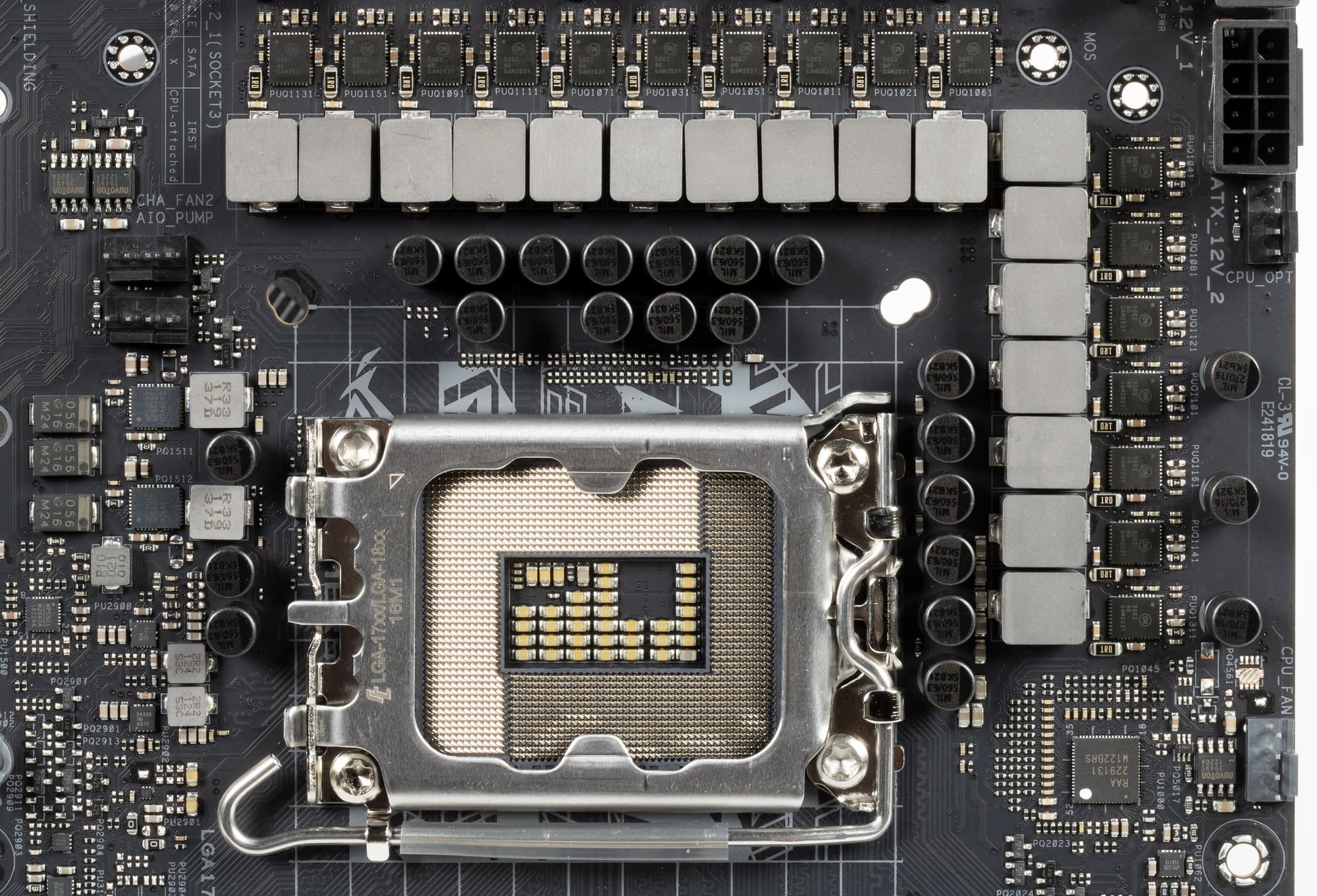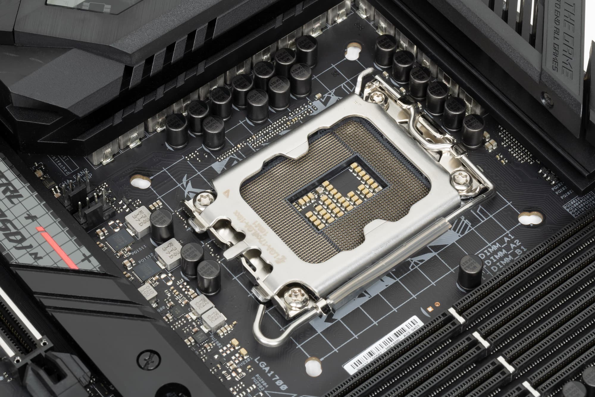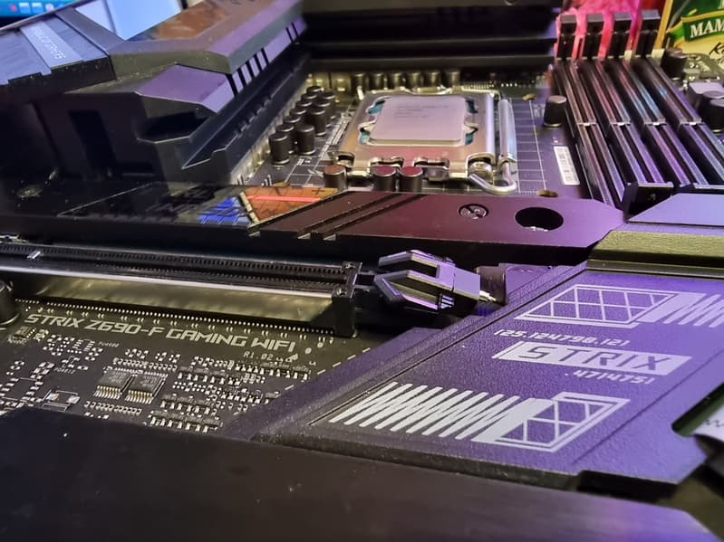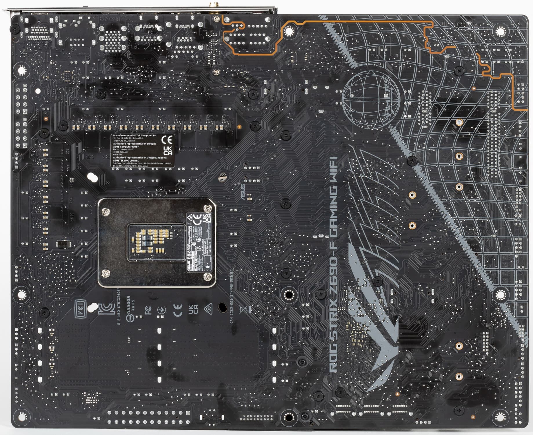 Еще раз надо напомнить, что Asus ROG Strix Z690-F Gaming WiFi поддерживает процессоры Intel Core 12-го поколения, выполненные под разъем (сокет) LGA1700. Система крепления систем охлаждения для CPU несовместима с той, что для LGA1151/1200. Для совместимости со старыми СО у данной платы имеются овальные отверстия вокруг сокета. Однако следует иметь в виду, что при использовании старых СО придется где-то приобретать или заказывать у производителя комплект крепежа под LGA 1700. Дело в в том, что новые процессоры 12ххх на 0.8 мм тоньше предшественников, и кулеры с жесткой установкой в матплате на фиксированную высоту просто не достанут до 12ххх. Подойдут лишь СО с пружинистой посадкой подошвы на процессор.