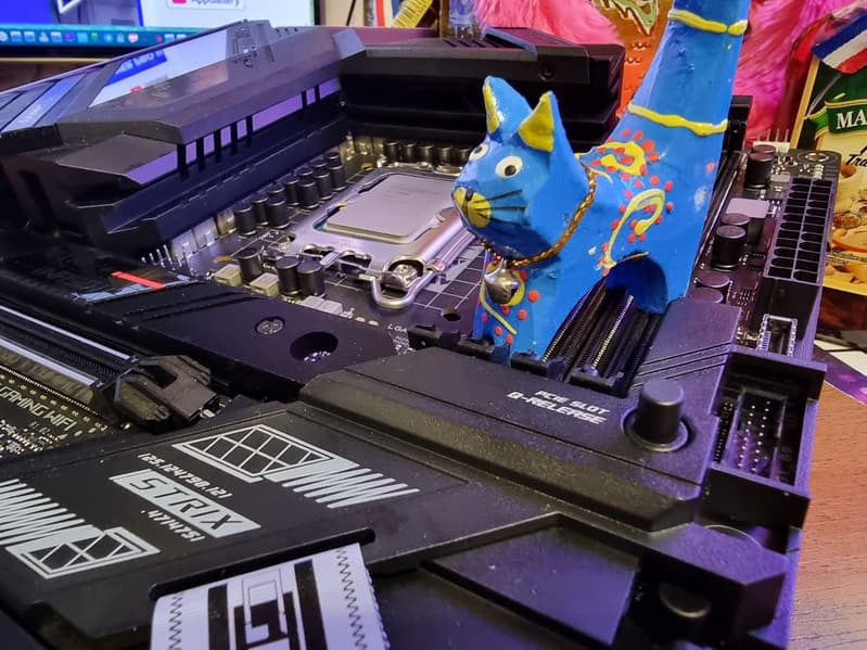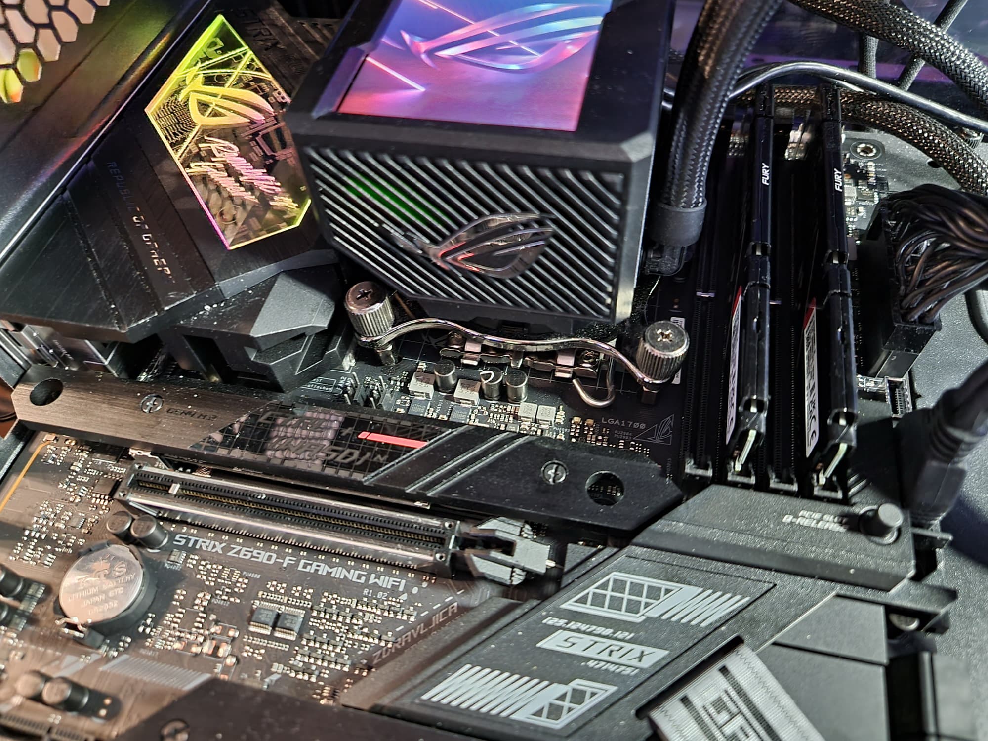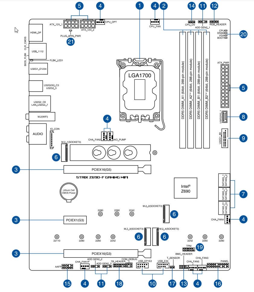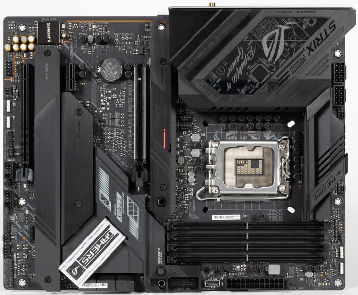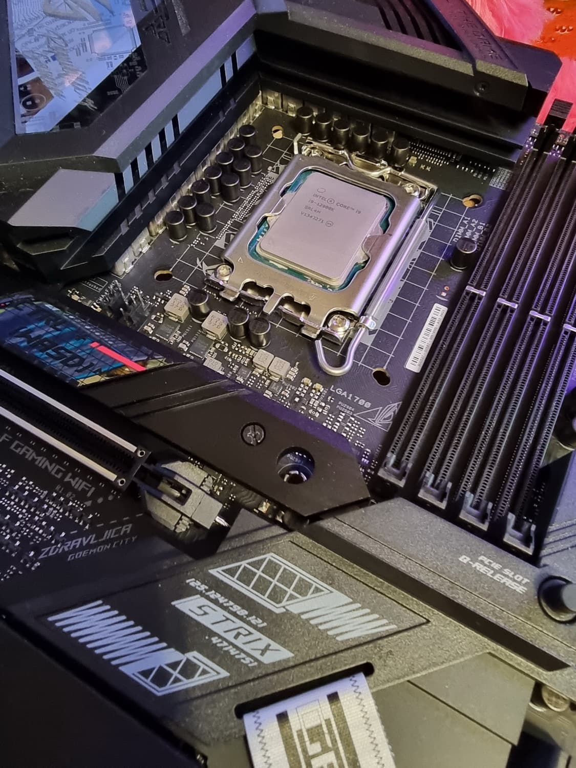 Еще раз надо напомнить, что Asus ROG Strix Z690-F Gaming WiFi поддерживает процессоры Intel Core 12-го поколения, выполненные под разъем (сокет) LGA1700. Система крепления систем охлаждения для CPU несовместима с той, что для LGA1151/1200. Для совместимости со старыми СО у данной платы имеются овальные отверстия вокруг сокета. Однако следует иметь в виду, что при использовании старых СО придется где-то приобретать или заказывать у производителя комплект крепежа под LGA 1700. Дело в в том, что новые процессоры 12ххх на 0.8 мм тоньше предшественников, и кулеры с жесткой установкой в матплате на фиксированную высоту просто не достанут до 12ххх. Подойдут лишь СО с пружинистой посадкой подошвы на процессор.