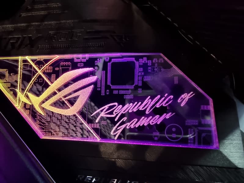 Радиатор VRM, идущий вдоль заднего блока портов, имеет кожух, прикрывающий тот самый блок, оснащенный подсветкой.