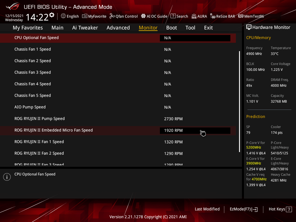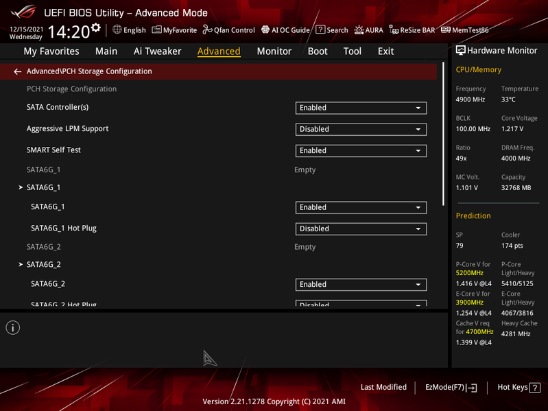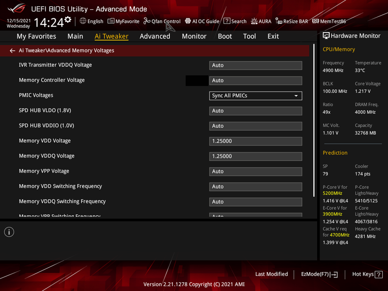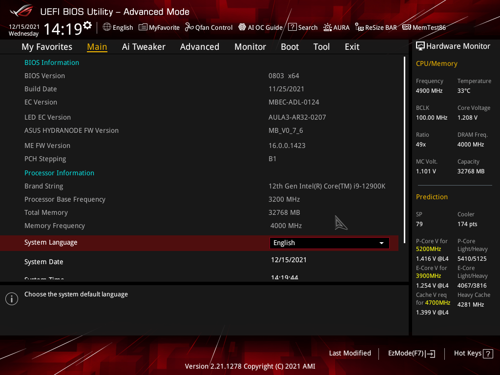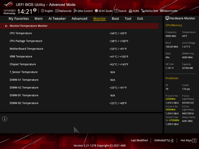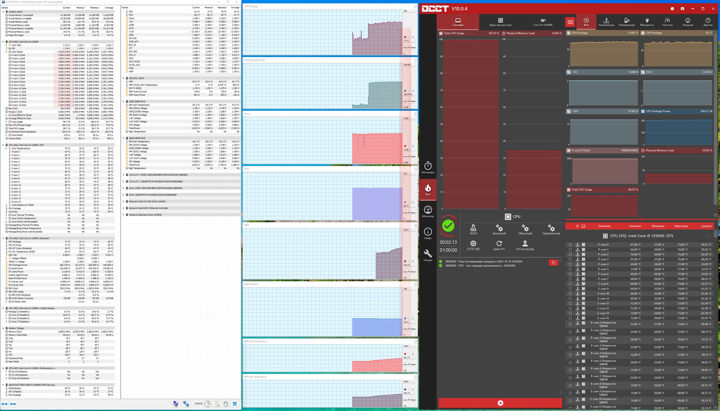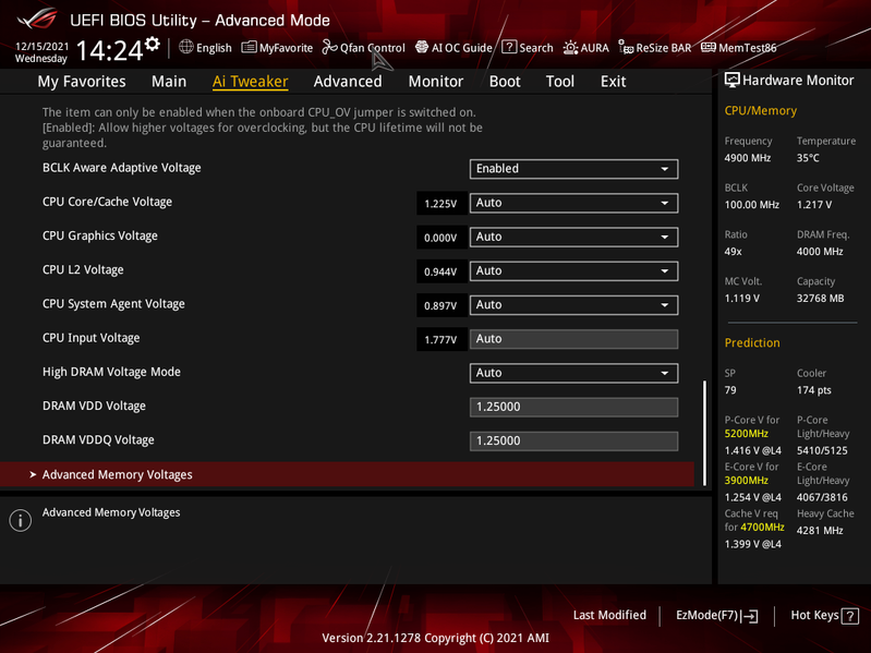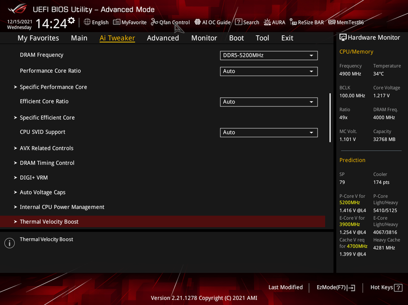 Для нефлагманского решения (хоть и из семейства ROG) — очень хорошо: мы получили 4,9 ГГц по всем P-ядрам (при этом всплески частот бывали и выше 5 ГГц) и 3,7 ГГц по всем Е-ядрам. Стоит напомнить, что Р-ядра — это обычные всем привычные ядра, имеющие по 2 потока каждый, «Р» — означает Performance, то есть производительные. «Е» — это энергоэффективные ядра, так называемые, малые ядра, у них по 1 потоку. В целом мы видим, что система по умолчанию, определив мощное питание матплаты, выставила очень приличный авторазгон.