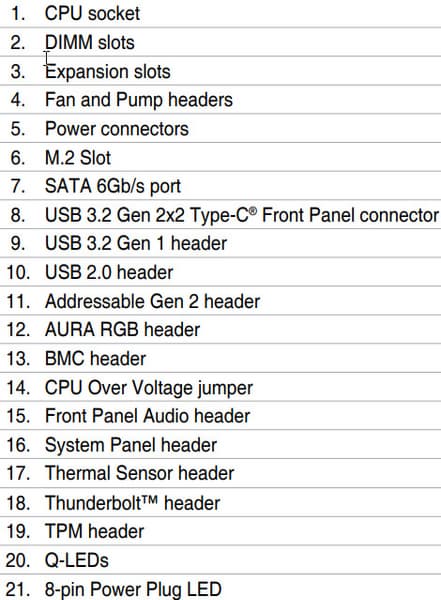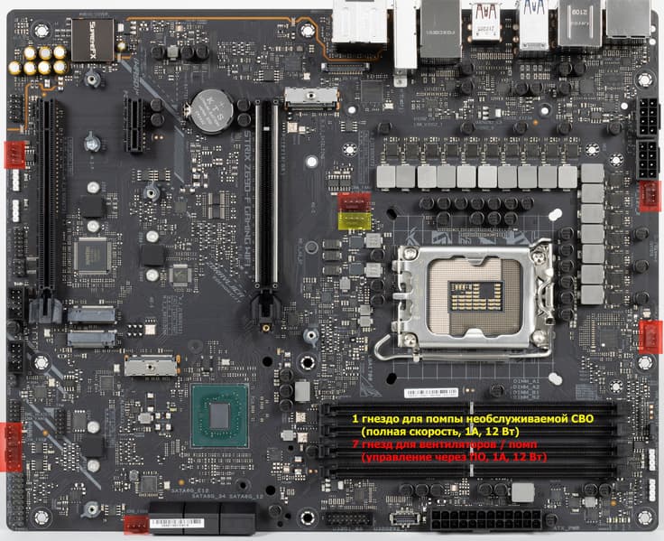 | Прочие внутренние элементы | 24-контактный разъем питания ATX 2 8-контактный разъем питания EPS12V 1 слот M.2 (E-key), занят адаптером беспроводных сетей 1 разъем для подключения порта USB 3.2 Gen2x2 Type-C 1 разъем для подключения 2 портов USB 3.2 Gen1 2 разъема для подключения 4 портов USB 2.0 8 разъемов для подключения 4-контактных вентиляторов и помп ЖСО 1 разъем для подключения неадресуемой RGB-ленты 3 разъема для подключения адресуемой ARGB-ленты 1 разъем аудио для передней панели корпуса 1 разъем Thunderbolt 1 разъем BMC 1 разъем TPM для устройств безопасности 1 разъем для термодатчикa 2 разъема для подключения управления с передней панели корпуса |
