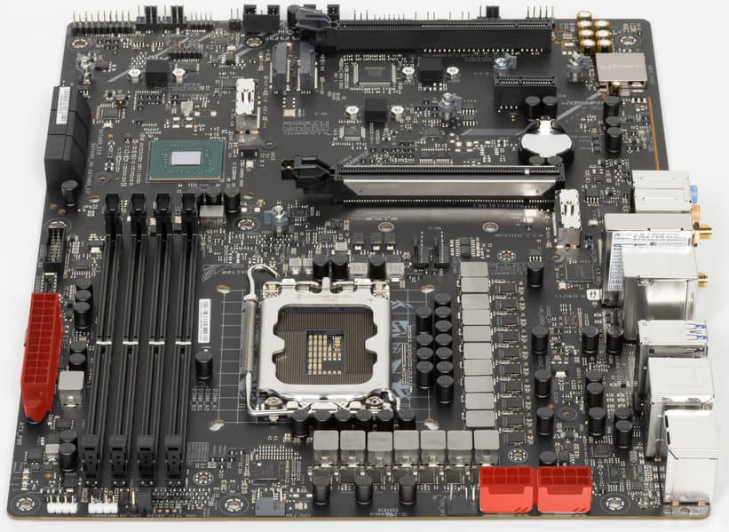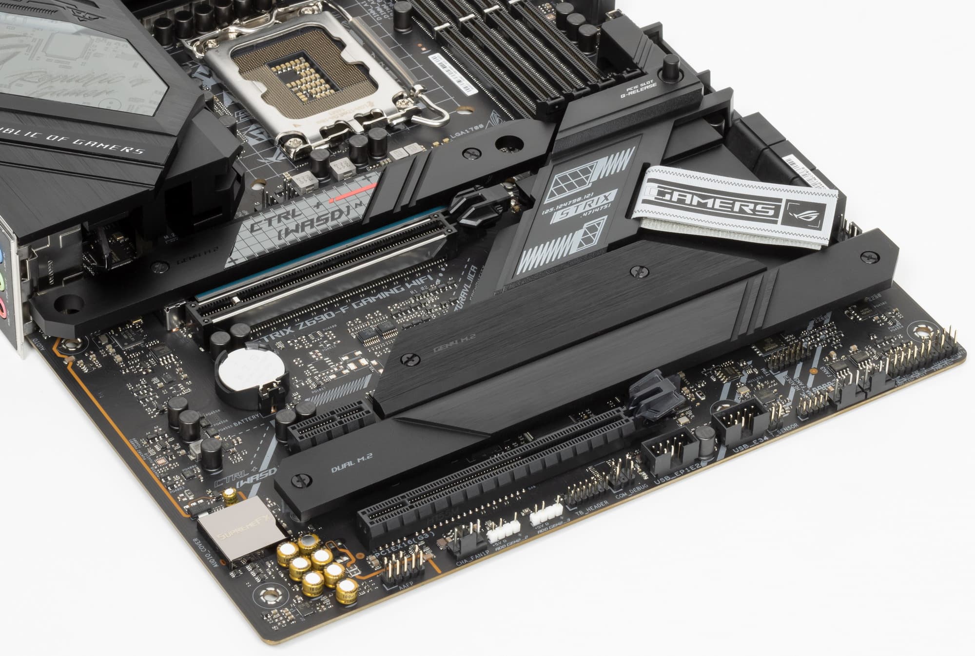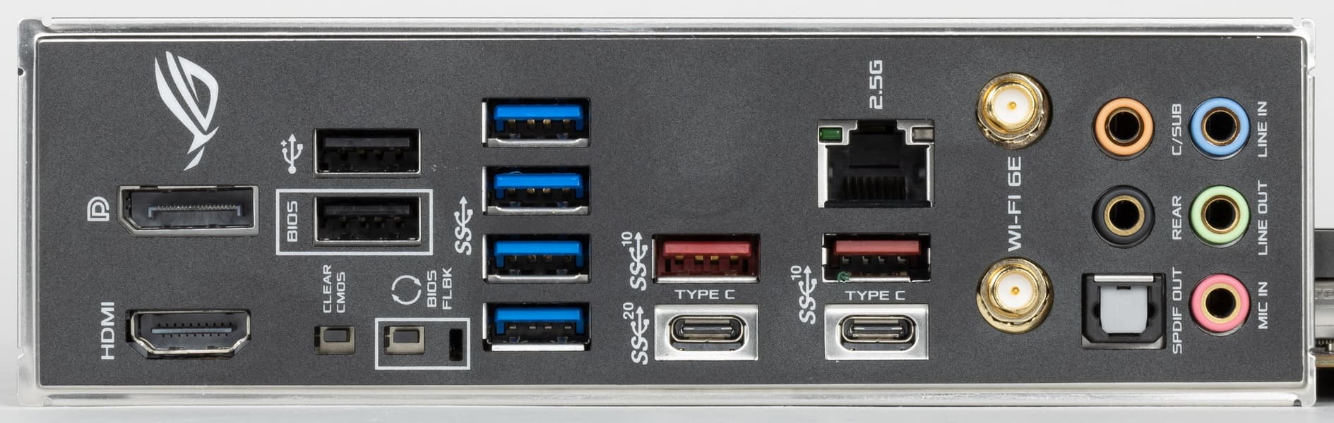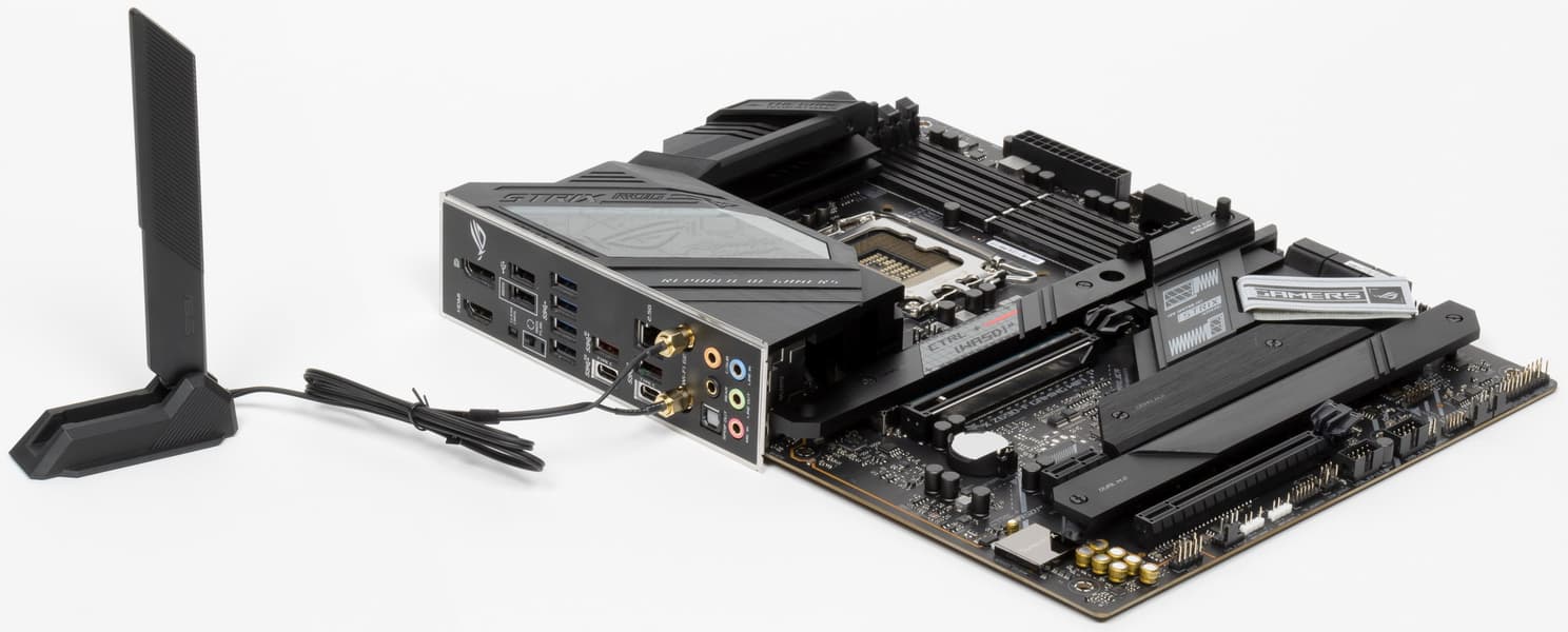 У платы 17 портов USB разных видов (включая 2 самых быстрых USB 3.2 Gen2×2, а также 3 USB 3.2 Gen2), 2 слота PCIe х16 (один из которых подключен к процессору 16 линиями PCIe 5.0, а второй подключен к чипсету работает в режиме х4 с любыми картами или в режиме x8 с картами с двумя слотами М.2, например Asus Hyper M.2 card), 4 слота M.2 (один из них подключен напрямую к процессору линиями PCIe 4.0, три других подключены к чипсету Z690 линиями PCIe 4.0), 6 портов SATA и 8 разъемов для вентиляторов.