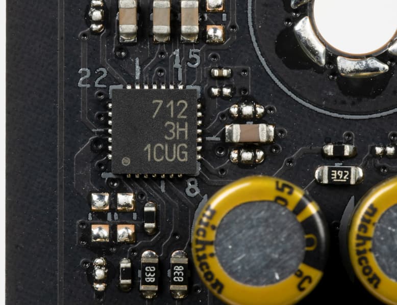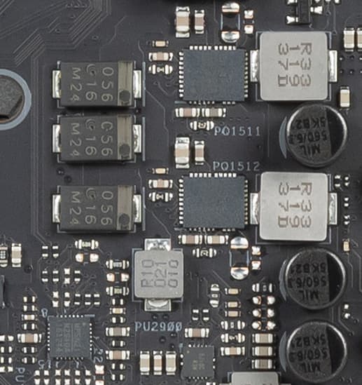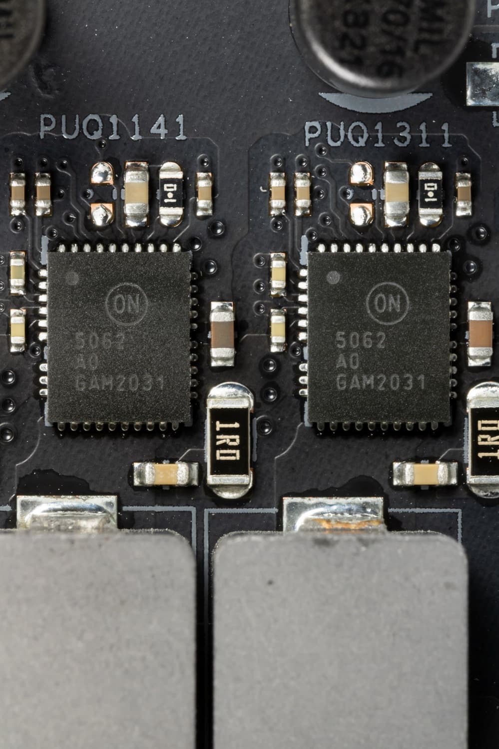 Каждый канал фазы имеет суперферритовый дроссель и FDMF5062 MOSFET от On Semiconductor на 70 А.