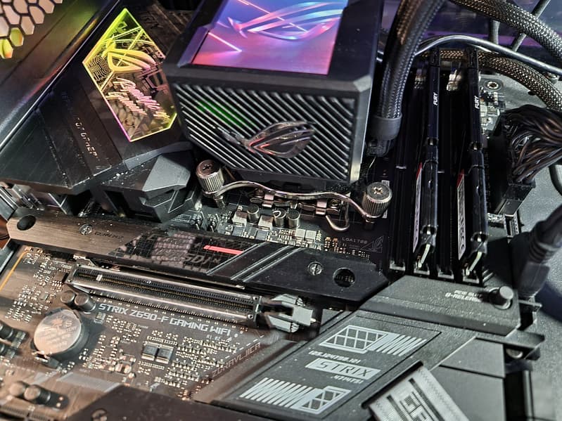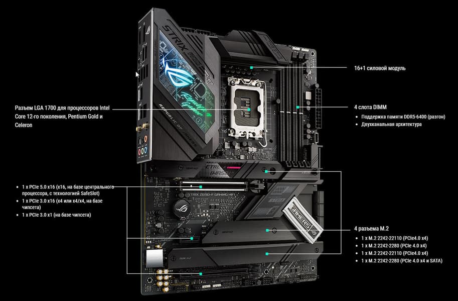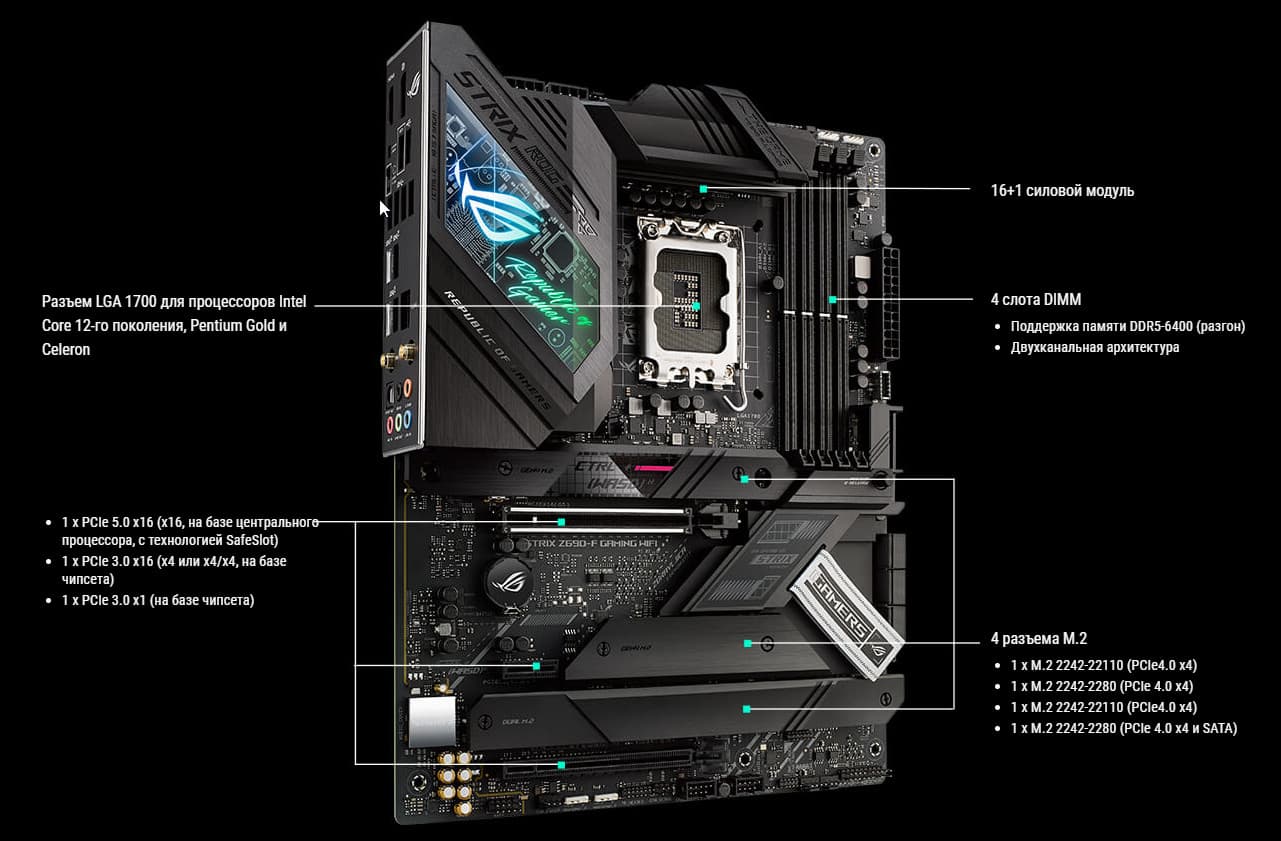 Материнская плата Asus ROG Strix Z690-F Gaming WiFi относится к семейству ROG Strix, это игровое решение среднего уровня с ценой около 40 тысяч рублей.
