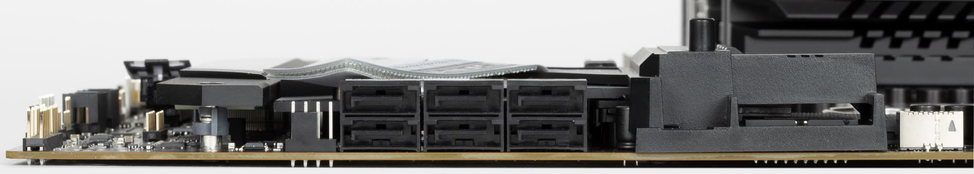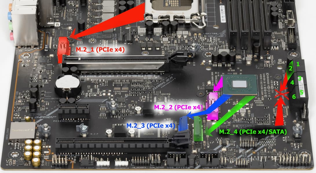 Всего у платы 6 разъемов Serial ATA 6 Гбит/с + 4 слота для накопителей в форм-факторе M.2. 4 порта SATA 1,2,3,4 реализованы через чипсет Z690 и поддерживают создание RAID.