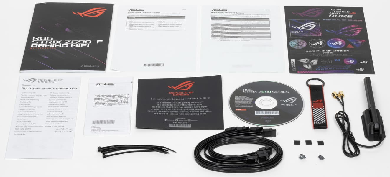 Кроме традиционных элементов типа руководства пользователя и кабелей SATA, комплект поставки включает антенну встроенного Wi-Fi-модуля, винтики для М.2 слотов, бонусные стикеры, накопитель с ПО, брелок и стяжки.