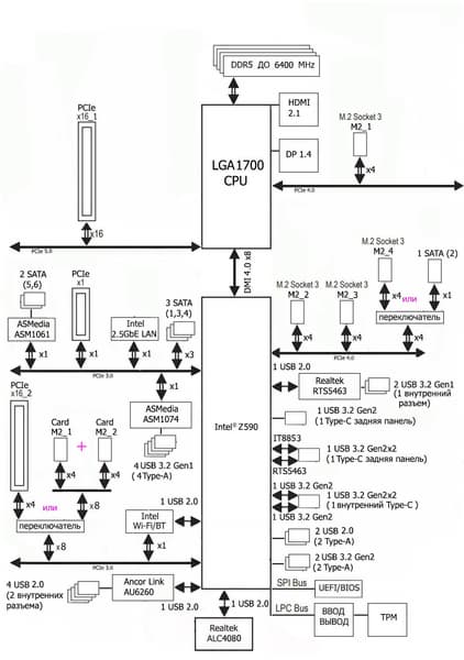 Процессоры Intel Core 12-го поколения (совместимые с сокетом LGA1700 и поддерживаемые Z690) имеют 20 линий ввода-вывода (16 PCIe 5.0, 4 PCIe 4.0), не имеют USB и SATA портов. При этом взаимодействие с Z690 идет по особому каналу Digital Media Interface 4.0 (DMI 4.0 x8). Все PCIe линии процессора идут на слоты расширения PCIe и порт М.2. Serial Peripheral Interface (SPI) используется для взаимодействия с системой UEFI/BIOS, а шина Low Pin Count (LPC) — для связи с устройствами ввода/вывода, не требующими высокой пропускной способности (контроллерами вентиляторов, TPM, старой периферии).