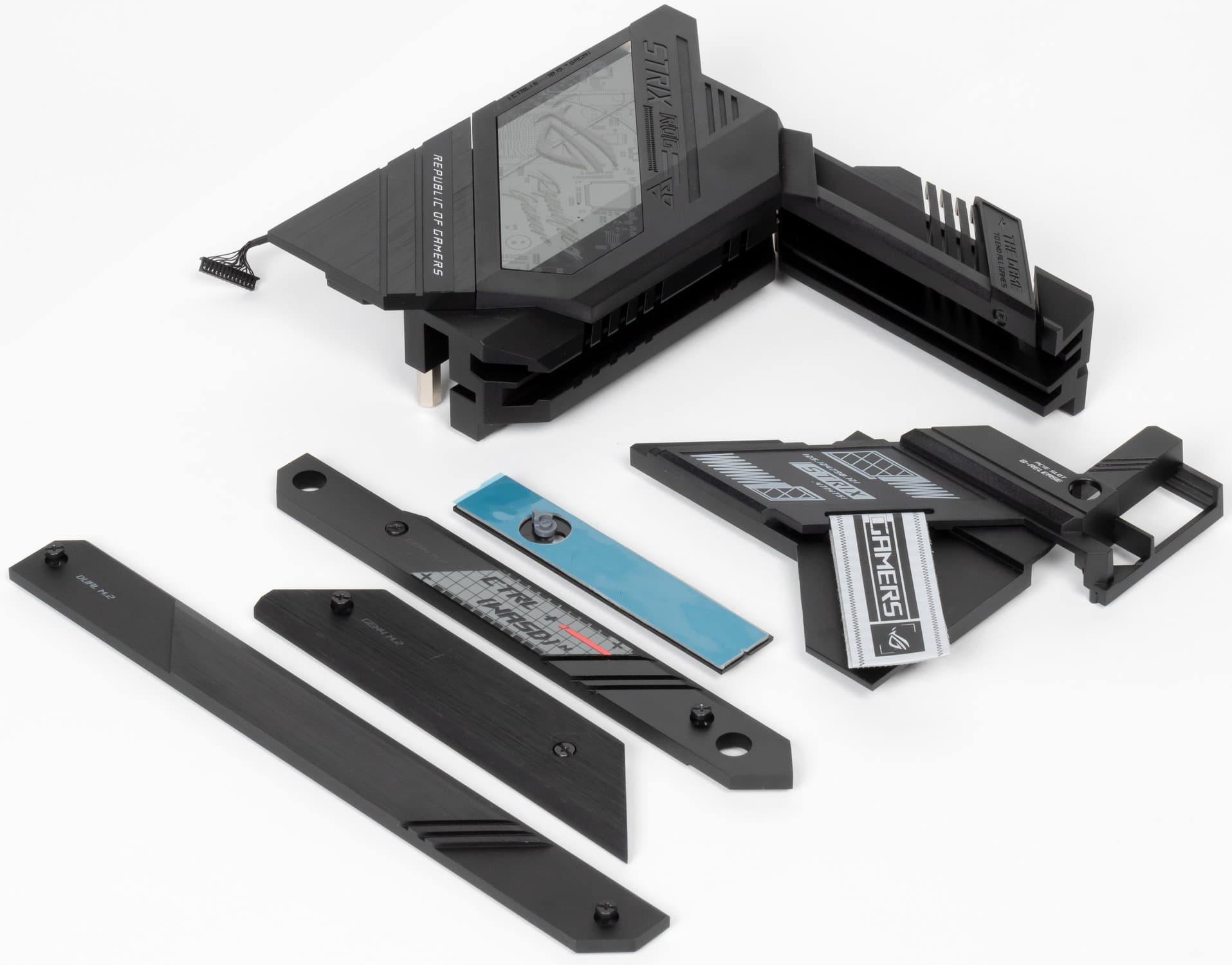 Плата поставляется в стандартной черно-красной коробке фирменного дизайна серии ROG. Комплект размещен под платой в отдельном отсеке.