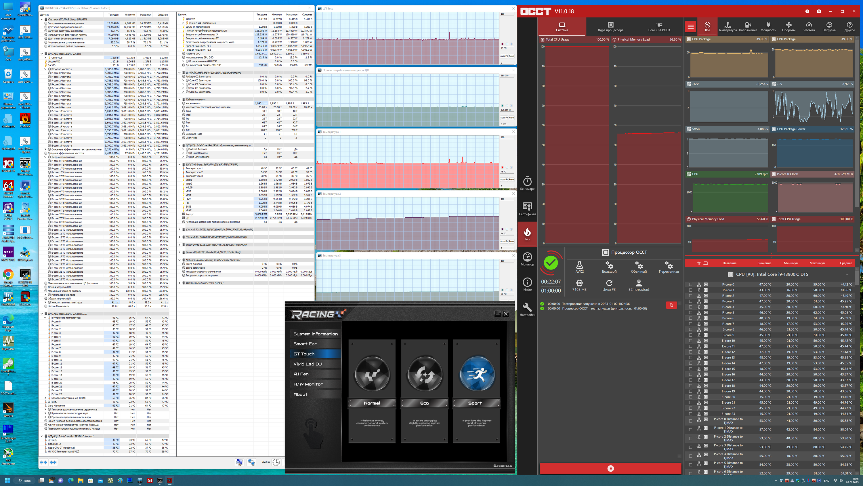 В режиме авторазгона мы получили 4.8 ГГц по всем P-ядрам, и 3.7 ГГц по всем Е-ядрам. Напомню, что Р-ядра — это обычные всем привычные ядра, имеющие по 2 потока каждый, «Р» — означает Performance, то есть производительные. «Е» — это энергоэффективные ядра, так называемые, малые ядра, у них по 1 потоку. Если оценивать с точки зрения позиционирования материнской платы, то авторазгон весьма хорош (ведь у нас плата не оверклокерская и не на топовом чипсете). Все остальные параметры системы по нагреву компонентов были в норме (разве что максимальный нагрев VRM достигал 70 градусов, однако не забываем, что я прогонял стресс-тесты, такой нагрузки в реальности никогда не бывает).