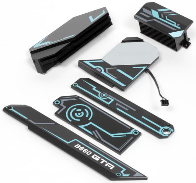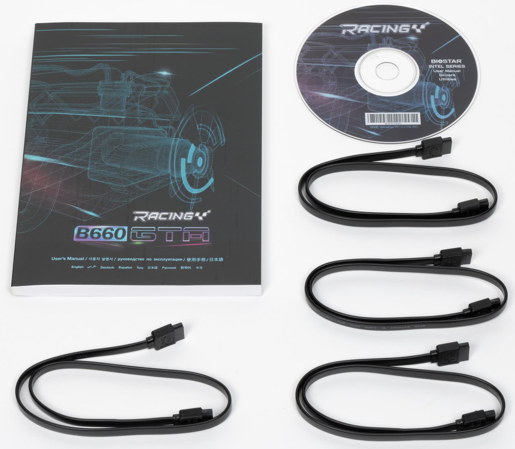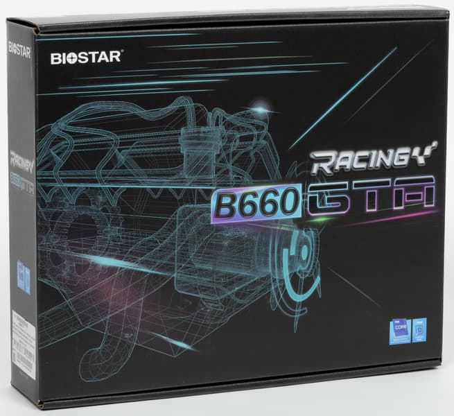 Biostar B660GTA Racing поставляется в стандартной коробке. Комплект размещен под платой в отдельном отсеке.