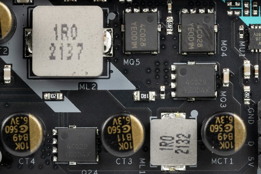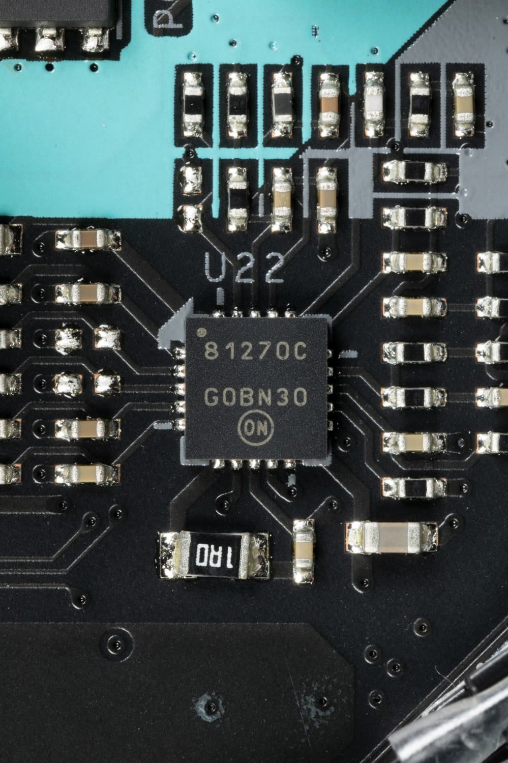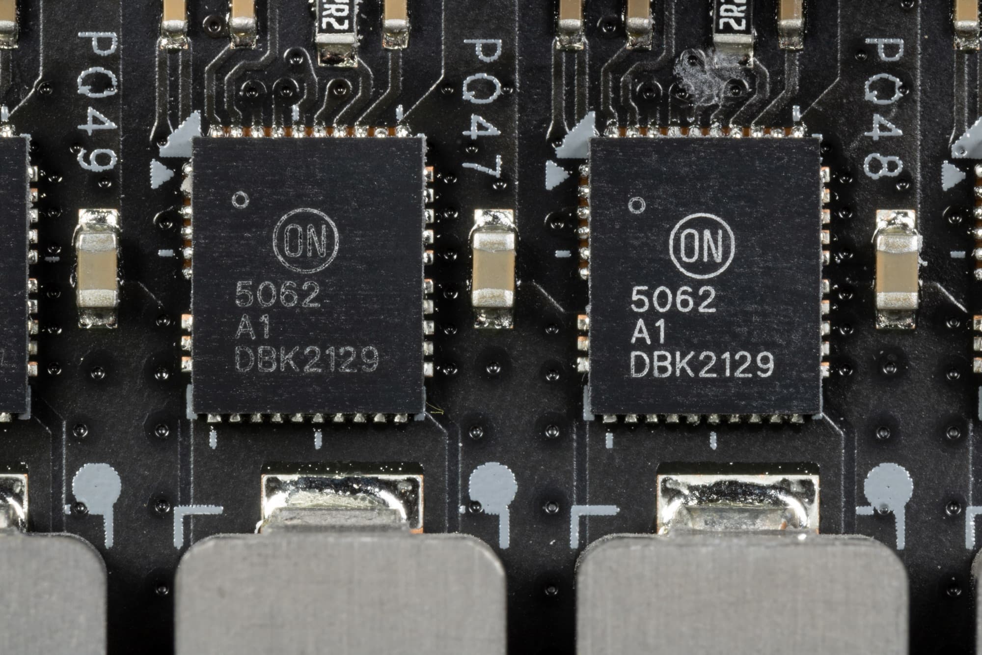 Каждый канал фазы имеет суперферритовый дроссель и FDMF5062 MOSFET от On Semi на 70A.