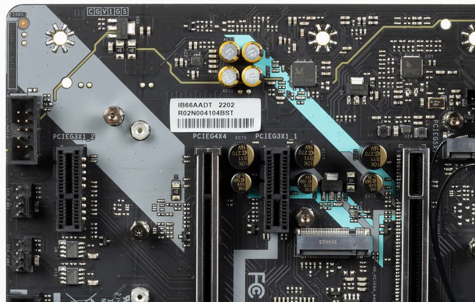Всего на плате есть 4 слота: PCIe x16_1 (для видеокарт или других устройств), PCIe x16_2 и два PCIe x1. Если про первый PCIe x16_1 я выше уже рассказал (он подключен к CPU), то PCIe x16_2 подключен к B660 и работает в режиме х4, а также он делит ресурсы с портом M.2 (M.2_PCIEG4_64G_2).