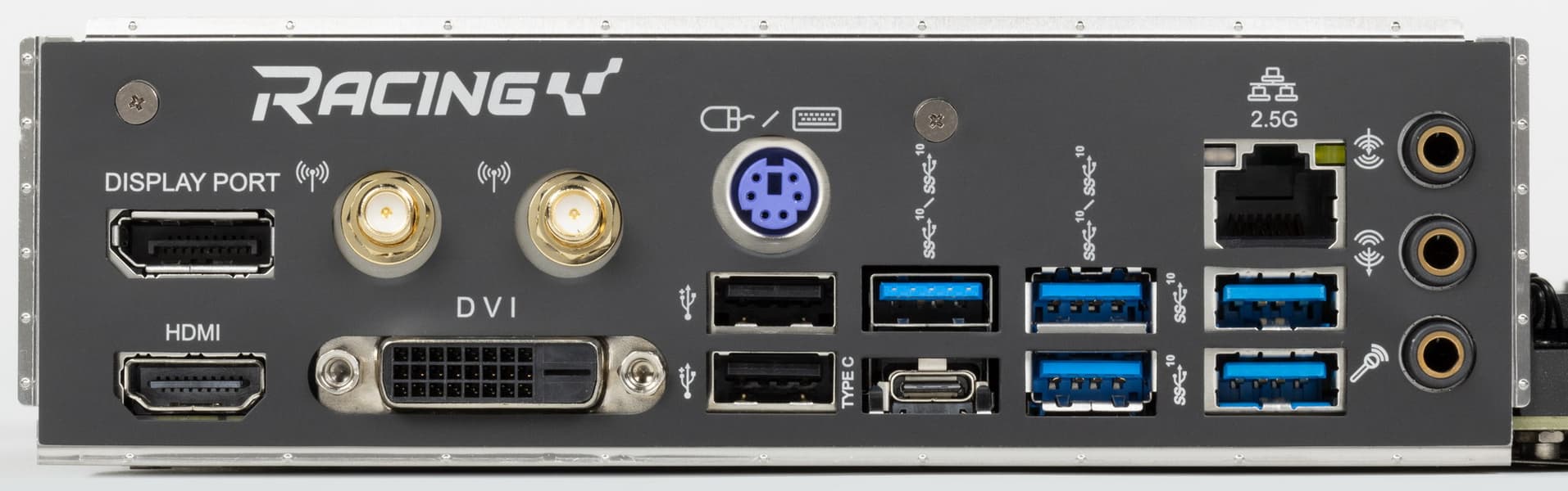 | Разъемы на задней панели | 1 × USB 3.2 Gen2 (Type-C) 5 × USB 3.2 Gen2 (Type-A) 2 × USB 2.0 (Type-A) 1 × RJ-45 3 аудиоразъема типа миниджек 2 антенных разъема 1 разъем HDMI 2.0 out 1 разъем Display Port 1.4 out 1 разъем DVI-D out 1 универсальный разъем PS/2 |
