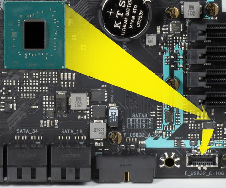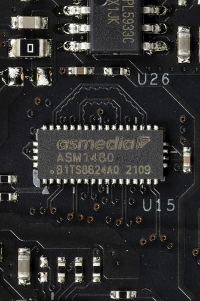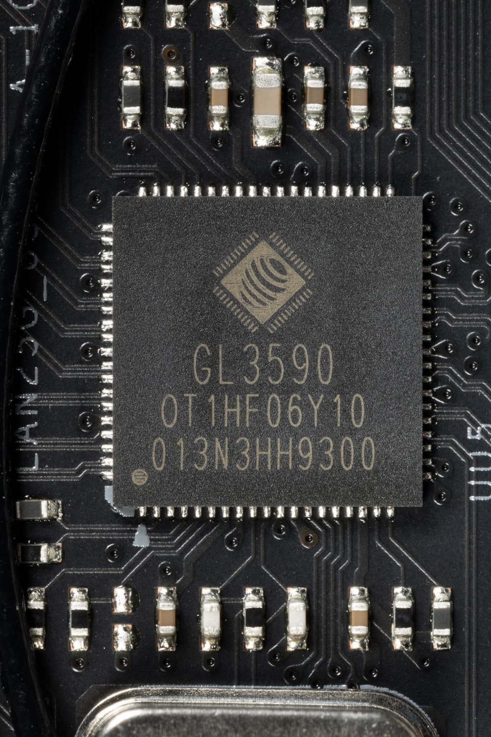 - 7 портов USB 3.2 Gen2: 3 реализованы через B660 и представлены на задней панели: 1 — портом Type-A (синего цвета); 1 – внутренним портом Type-C (для подключения к соответствующему разъему на передней панели корпуса); 1 – портом Type-C на задней панели; еще 4 реализованы через контроллер Genesys Logic GL3590 (на него потрачена 1 линия PCIe от B660) и представлены: 4 портами Type-A (синего цвета) на задней панели;
