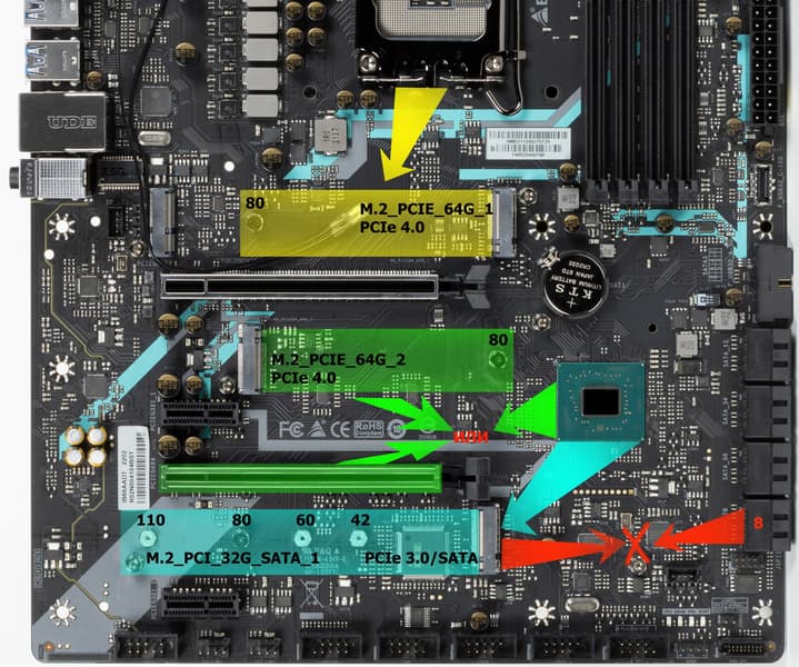Все слоты М.2 поддерживают размер модулей 2280, а третий слот позволяет установить накопители размером 2242/2260/2280/22110. На всех M.2 можно организовать RAID, а также использовать для Intel Optane Memory. Слот М.2_PCIEG4_32G_SATA (третий) делит ресурсы с портом SATA 8: при использовании в М.2 слоту накопителя с SATA интерфейсом порт SATA 4 отключен.
