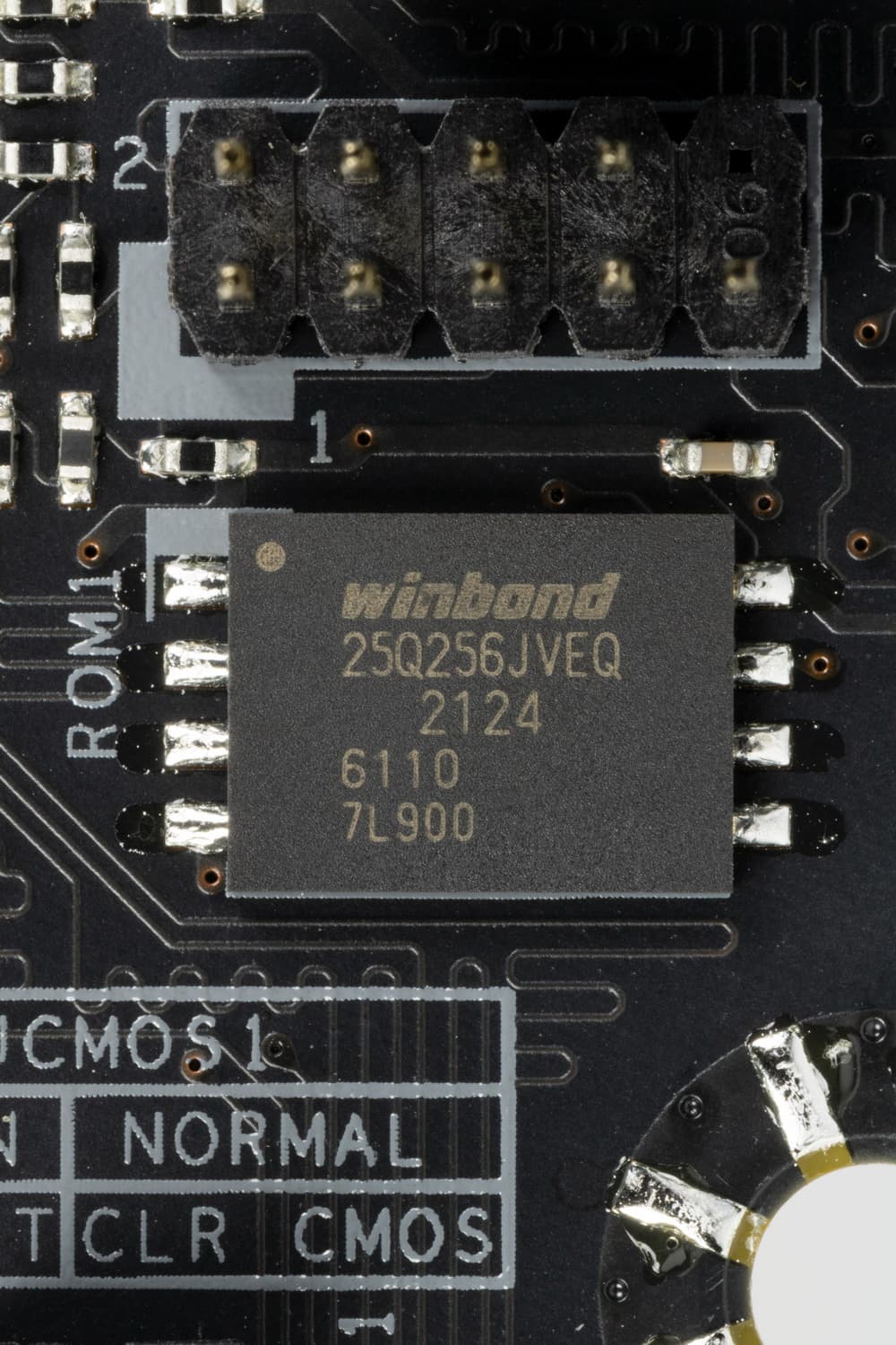 Также мы видим хорошую систему охлаждения каждого потенциально греющегося элемента, включая накопители в слотах M.2. Сетевые возможности удовлетворительные: быстрый проводной контроллер 2,5 Гбит/с, а также слот для современного беспроводного контроллера (его надо приобретать отдельно). В числе других плюсов можно упомянуть широкие возможности для подключения RGB-устройств подсветки и дизайн самой платы.