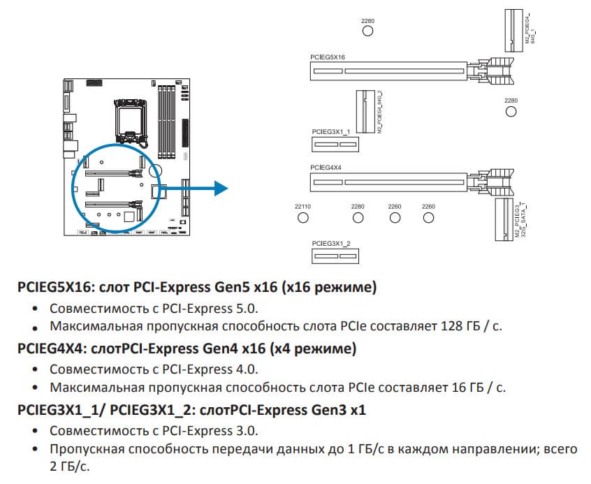 Теперь посмотрим выше на то, как работают процессоры в данной конфигурации. У CPU 12/13-го поколений всего 20 линий PCIe, 4 из них версии PCIe 4.0 отведены на порт М.2 (M.2_PCIEG4_64G_1).