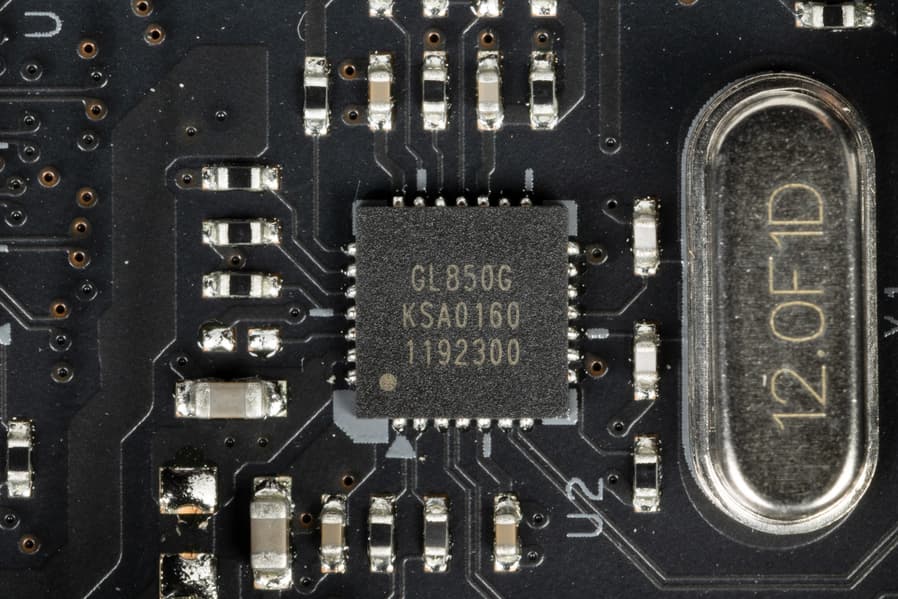 - 6 портов USB 2.0/1.1: 4 реализованы через Genesys Logic GL850G (на него потрачена 1 линия USB 2.0 от B660) и представлены двумя внутренними разъемами на материнской плате (каждый на 2 порта); еще 2 реализованы через B660 и представлены: 2 портами Type-A (черного цвета) на задней панели.