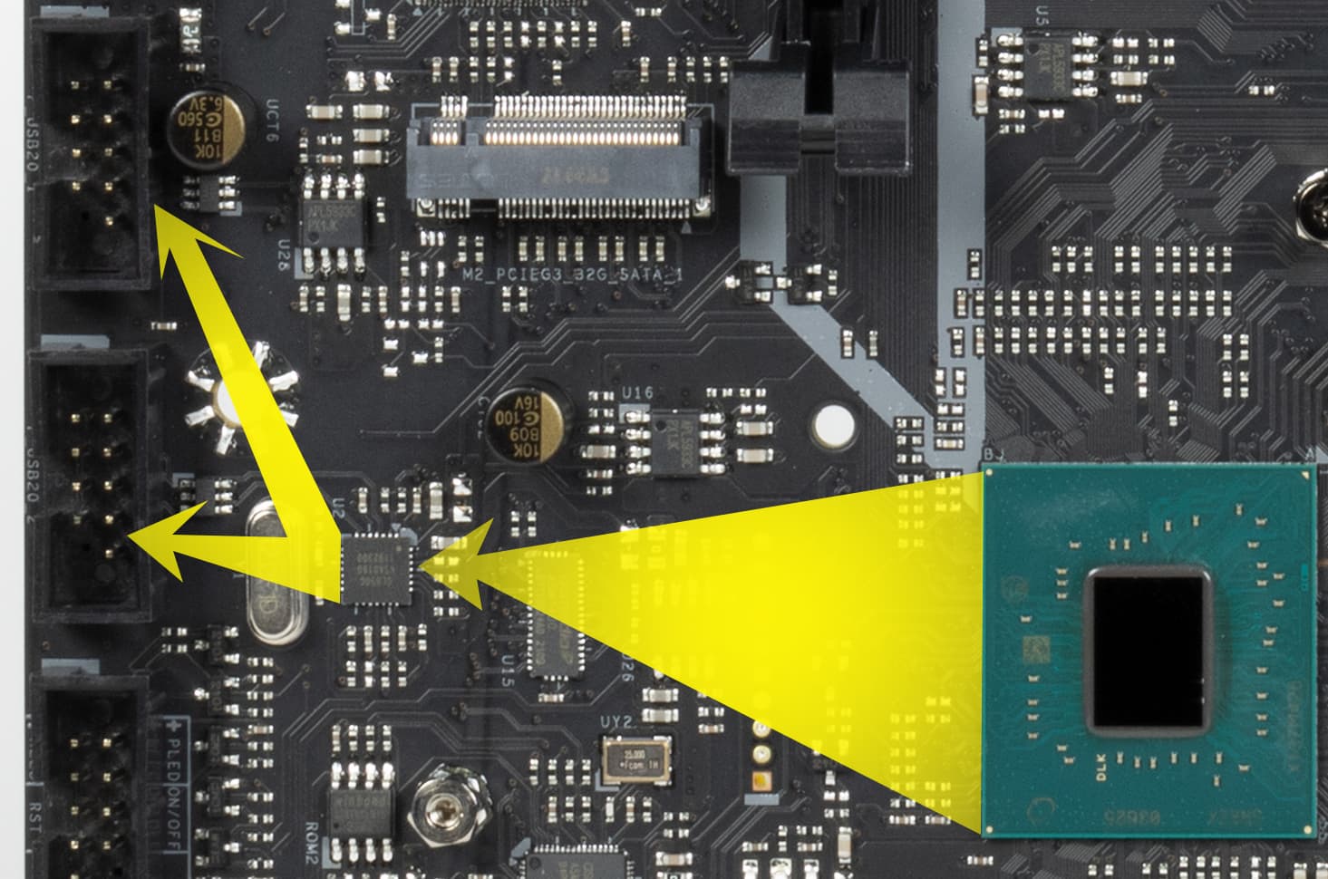 14 линий PCIe оказались занятыми (6 PCIe 4.0 + 8 PCIe 3.0), плюс 4 порта SATA. В данном случае связь с аудиокодеками идет через HDA-соединение (USB 2.0 не тратится). Также один USB 2.0 расходуется на поддержку BT (при наличии слота M.2 (key E) и еще одна линия USB 2.0 идет на поддержку контроллера GL850G. Детально об этом ниже в разделе USB-портов.
