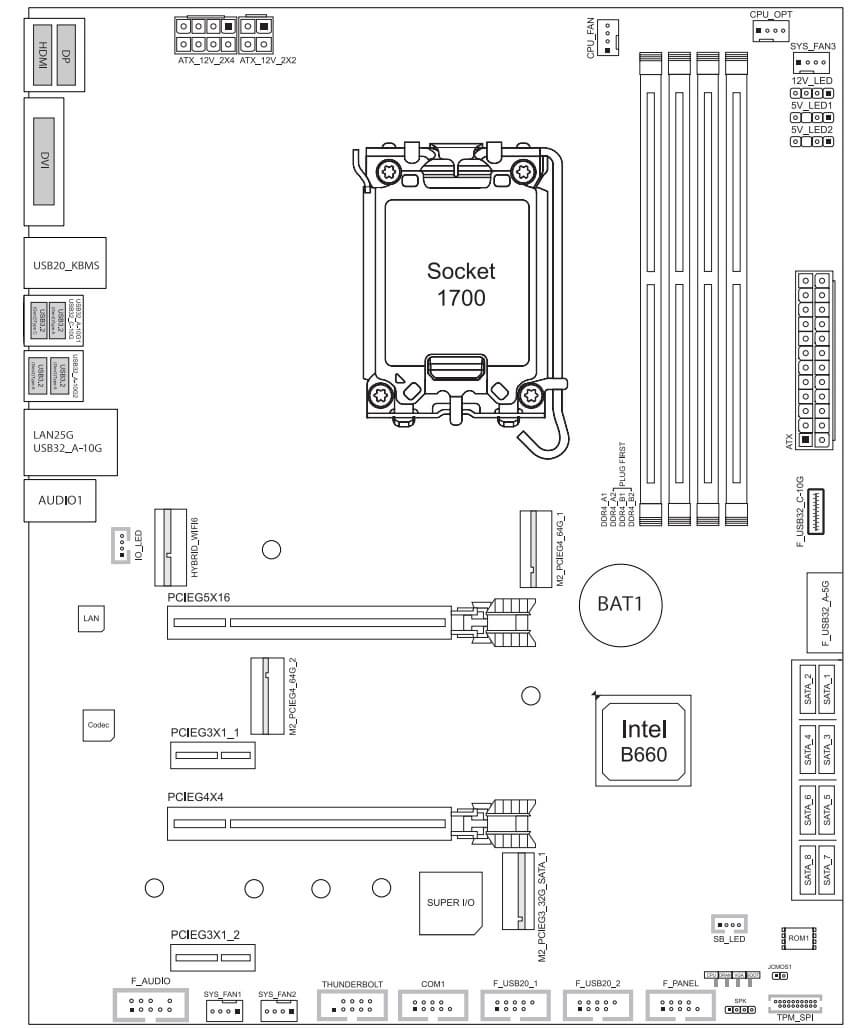 Процессоры Intel Core 12-го поколения (совместимые с сокетом LGA1700 и поддерживаемые B660/Z690) имеют 20 линий ввода-вывода (16 PCIe 5.0, 4 PCIe 4.0), не имеют USB и SATA портов. При этом взаимодействие с B660 идет по особому каналу Digital Media Interface 4.0 (DMI 4.0 x4 (именно х4!)). Все PCIe линии процессора идут на слоты расширения PCIe и порт М.2. Serial Peripheral Interface (SPI) используется для взаимодействия с системой UEFI/BIOS, а шина Low Pin Count (LPC) — для связи с устройствами ввода/вывода, не требующими высокой пропускной способности (контроллерами вентиляторов, TPM, старой периферии).