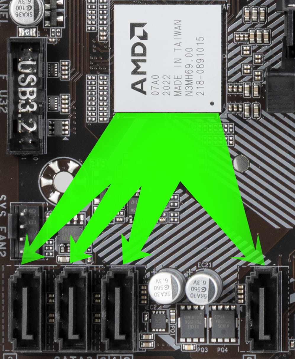 Кроме USB-портов, к которым мы подойдем позже, чипсет A520 обладает 6 PCIe линиями и 2 портами SATA. Считаем, сколько линий уходит на поддержку (связь) с тем или иным элементом: