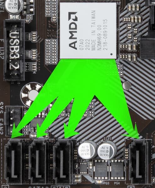 Порты SATA реализованы через чипсет A520 и поддерживают создание RAID.