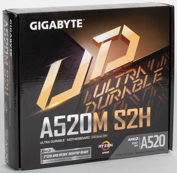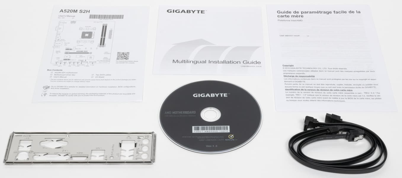 Gigabyte A520M-S2H поставляется в стандартной коробке. Комплект размещен под платой в отдельном отсеке.