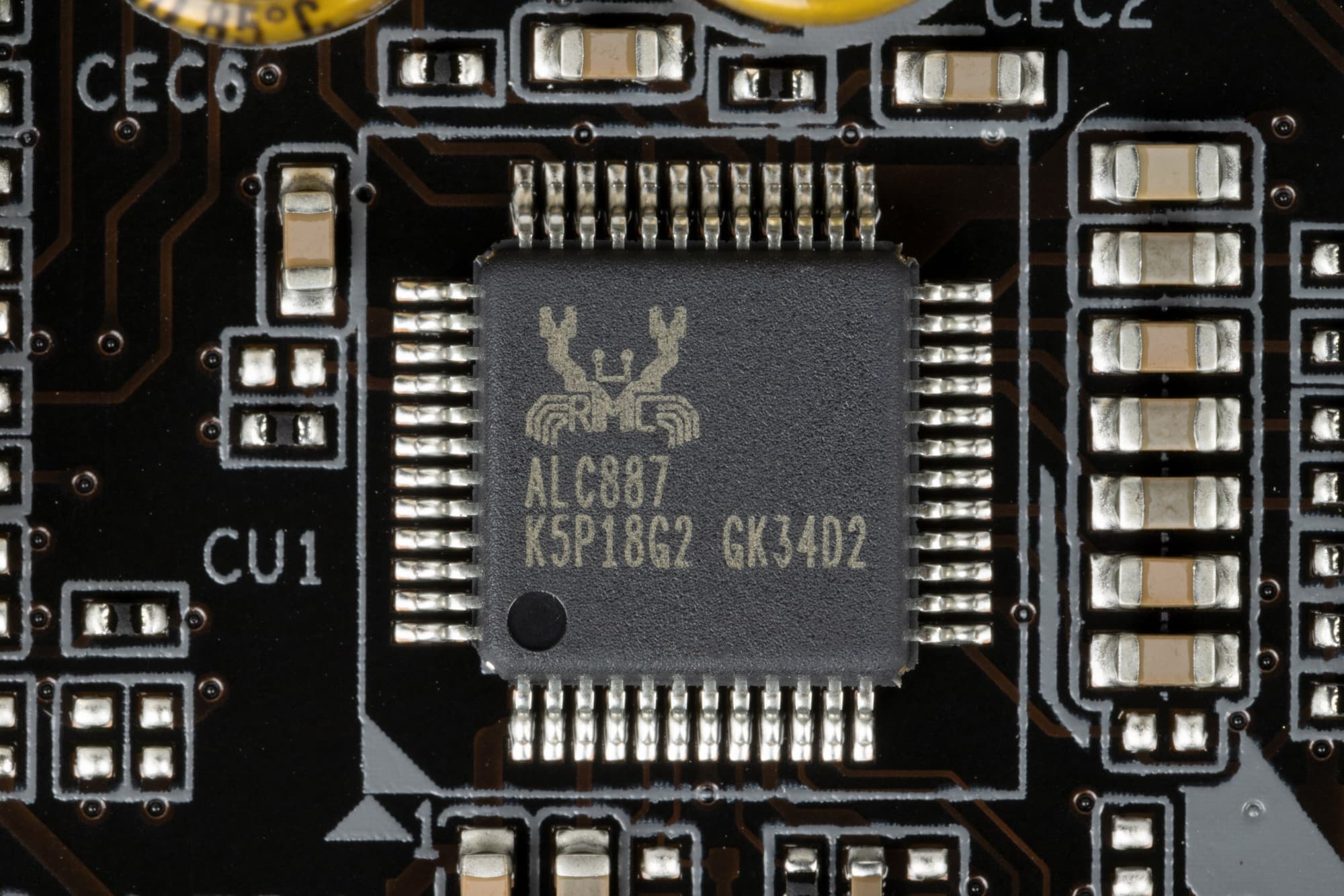 Мы знаем, что почти во всех современных материнских платах звуковым кодеком является продукт от Realtek, обеспечивающий вывод звука по схемам до 7.1, в последнее время это стал ALC4080 с характеристиками 32 бит / 384 кГц. До того мы несколько лет лицезрели ALC1220 с характеристиками по-проще. Однако в данном случае применен очень старый Realtek ALC887 (который как-то даже дико характеризовать как 7.1).