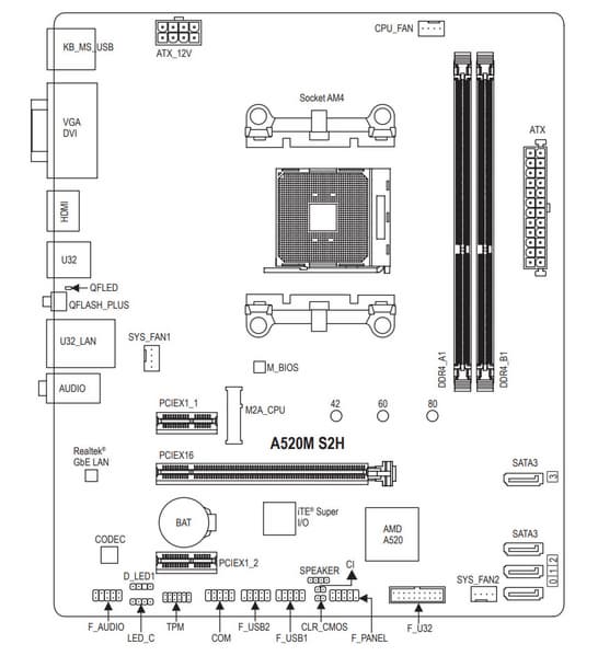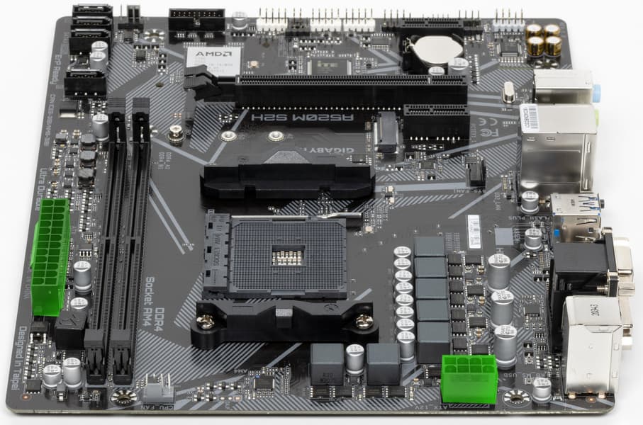 Форм-фактор Mini-ITX имеет размеры 170×170 мм, microATX до 244×244 мм, ATX до 305×244 мм, а E-ATX — до 305×330 мм. Материнская плата Gigabyte A520M-S2H выполнена в форм-факторе microATX, имеет размеры 244×205 мм, и на ней имеются 6 монтажных отверстий для установки в корпус.