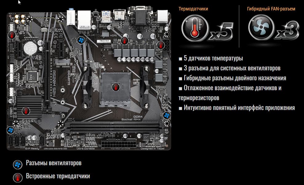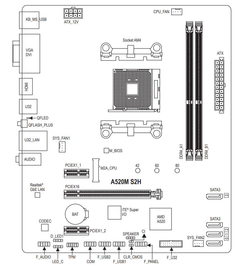 | Разъемы для накопителей | 4 × SATA 6 Гбит/с (A520) 1 × M.2 (CPU, PCIe 3.0 x4/SATA для устройств формата 2242/2260/2280) |