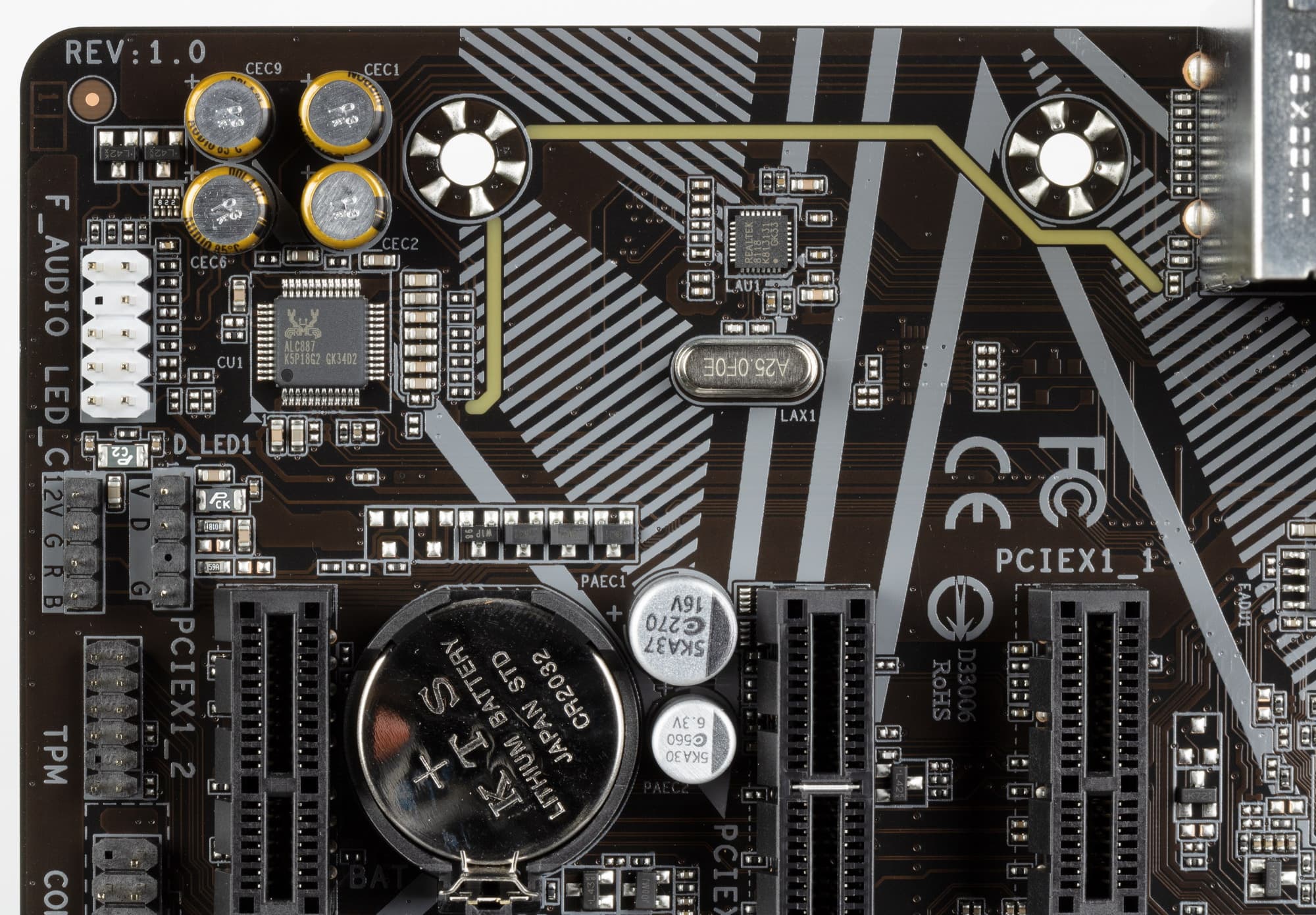 Аудиотракт вынесен на угловую часть платы, не пересекается с другими элементами. Все аудиоразъемы на задней панели имеют привычную цветовую окраску.