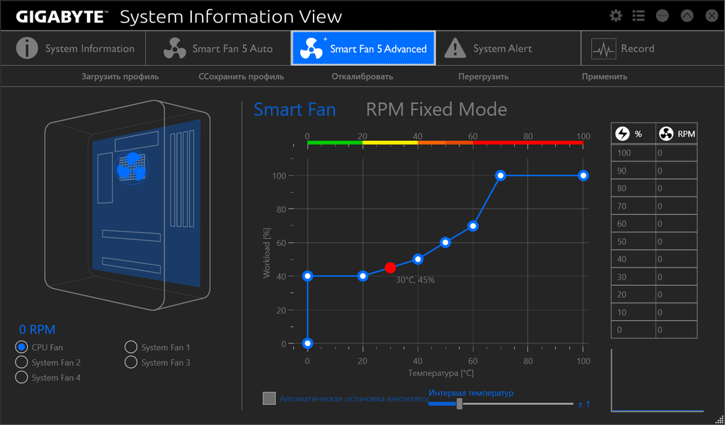 но и позволяет настроить работу подключенных к материнской плате вентиляторов. Можно перебрать готовые варианты режимов работы СО: