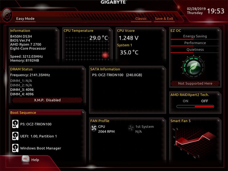 Easy Mode предназначен для пользователей, ничего не понимающих в тонкостях настройки работы процессора, памяти и пр. Здесь можно выбрать язык интерфейса, поменять дату, время, настроить работу запитанных через материнскую плату вентиляторов/кулеров, выбрать загрузочный диск, выполнить проверку наличия новой версии BIOS.