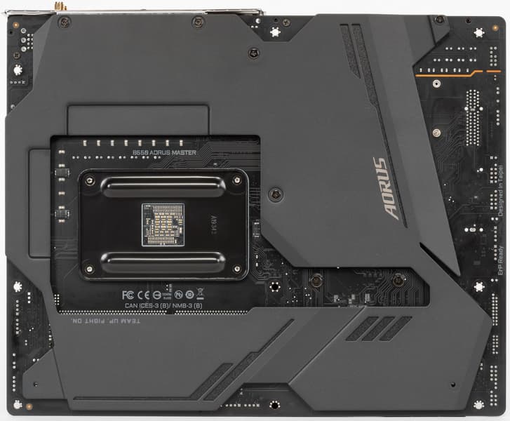 С оборотной стороны платы имеется задняя пластина, служащая не только как защита при монтаже матплаты, а также элементом жесткости PCB, но и в качестве дополнительного охладителя области VRM с обратной стороны печатной платы.