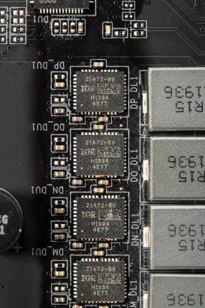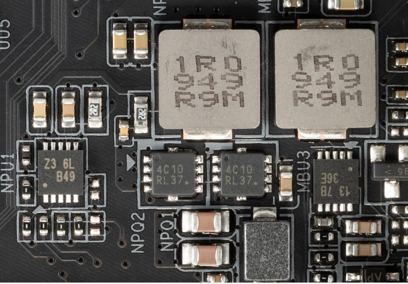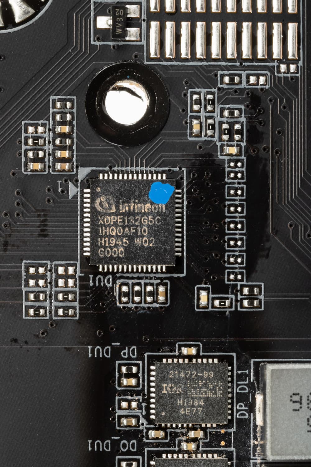 Каждый канал фазы имеет суперферритовую катушку и OptiMOS TDA21472 от Infineon (IOR), рассчитанные на максимальный ток в 70А.