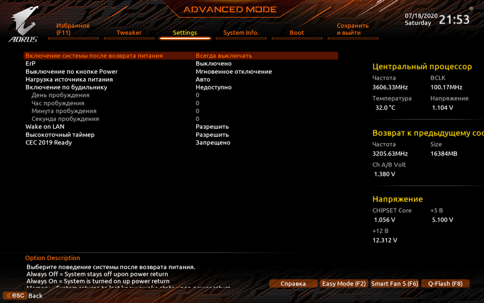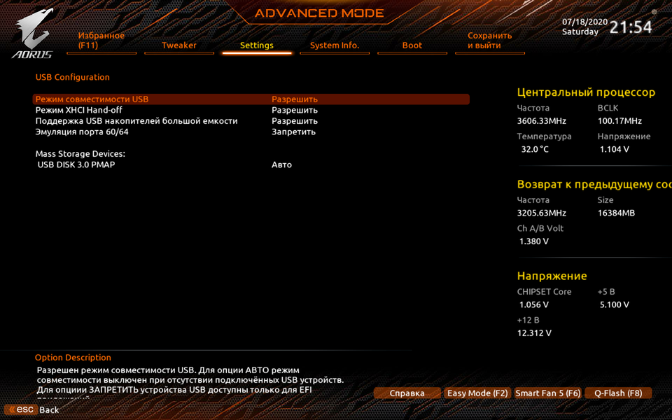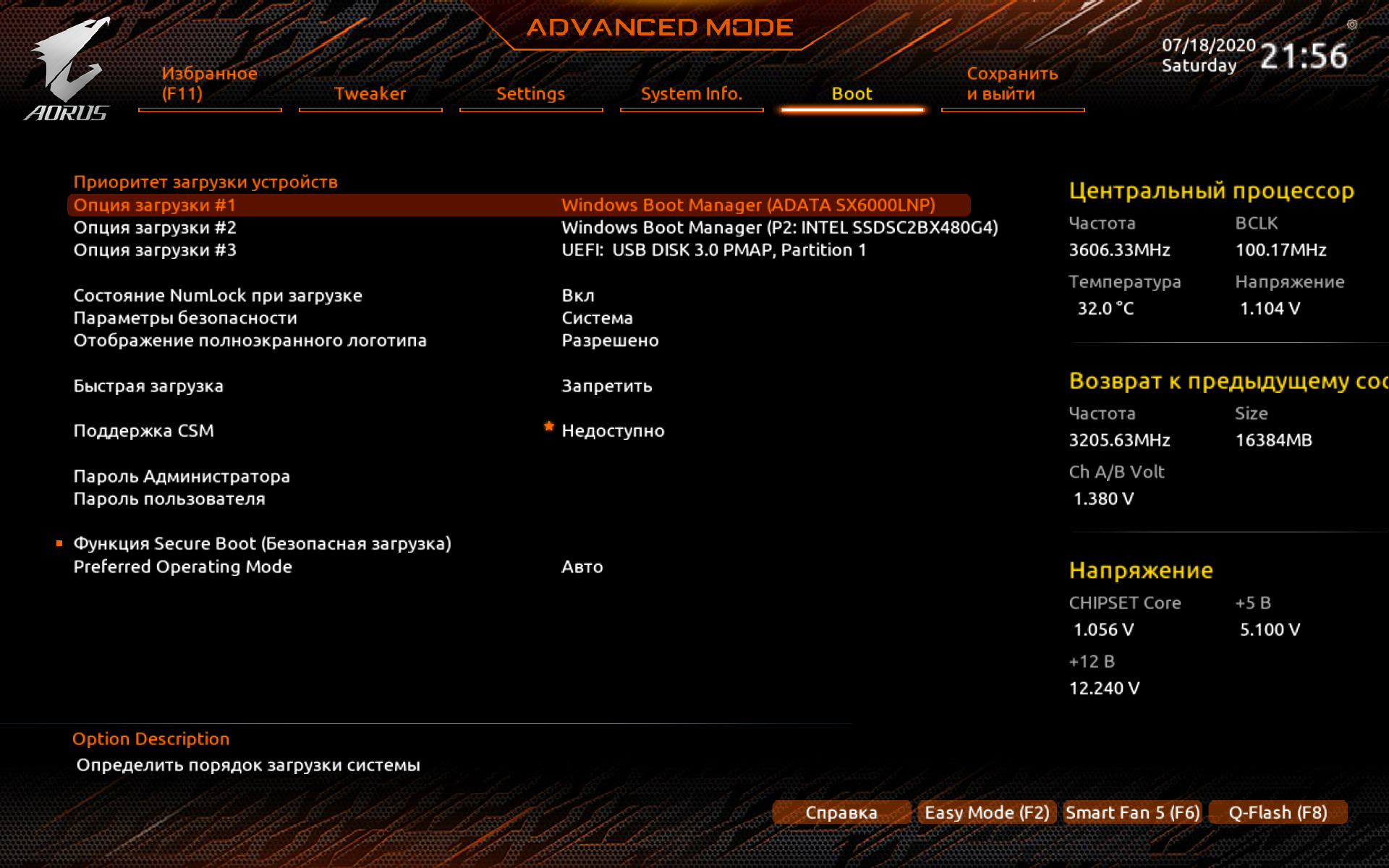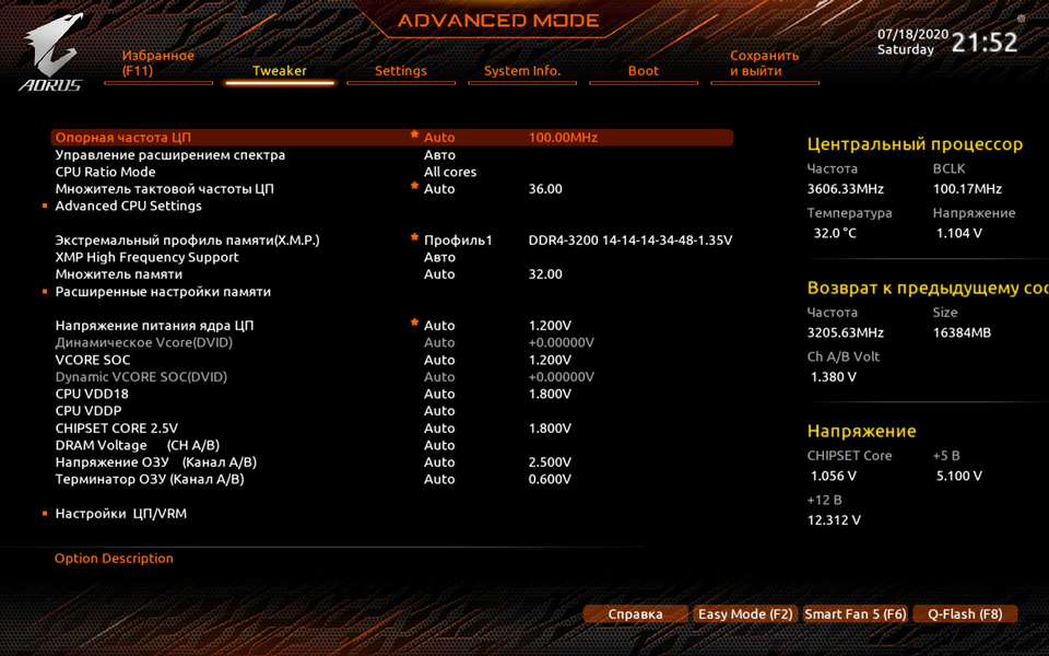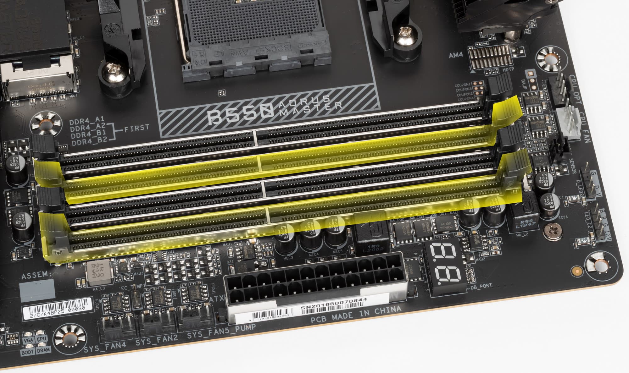 Для установки модулей памяти на плате Aorus имеется четыре DIMM-слота (для работы памяти в Dual Channel в случае использования всего 2 модулей их следует устанавливать в А2 и B2. Плата поддерживает небуферизованную память DDR4 (non-EСС), а максимальный объем памяти составляет 128 ГБ (при использовании UDIMM последнего поколения по 32 ГБ). Разумеется, поддерживаются профили XMP.