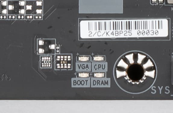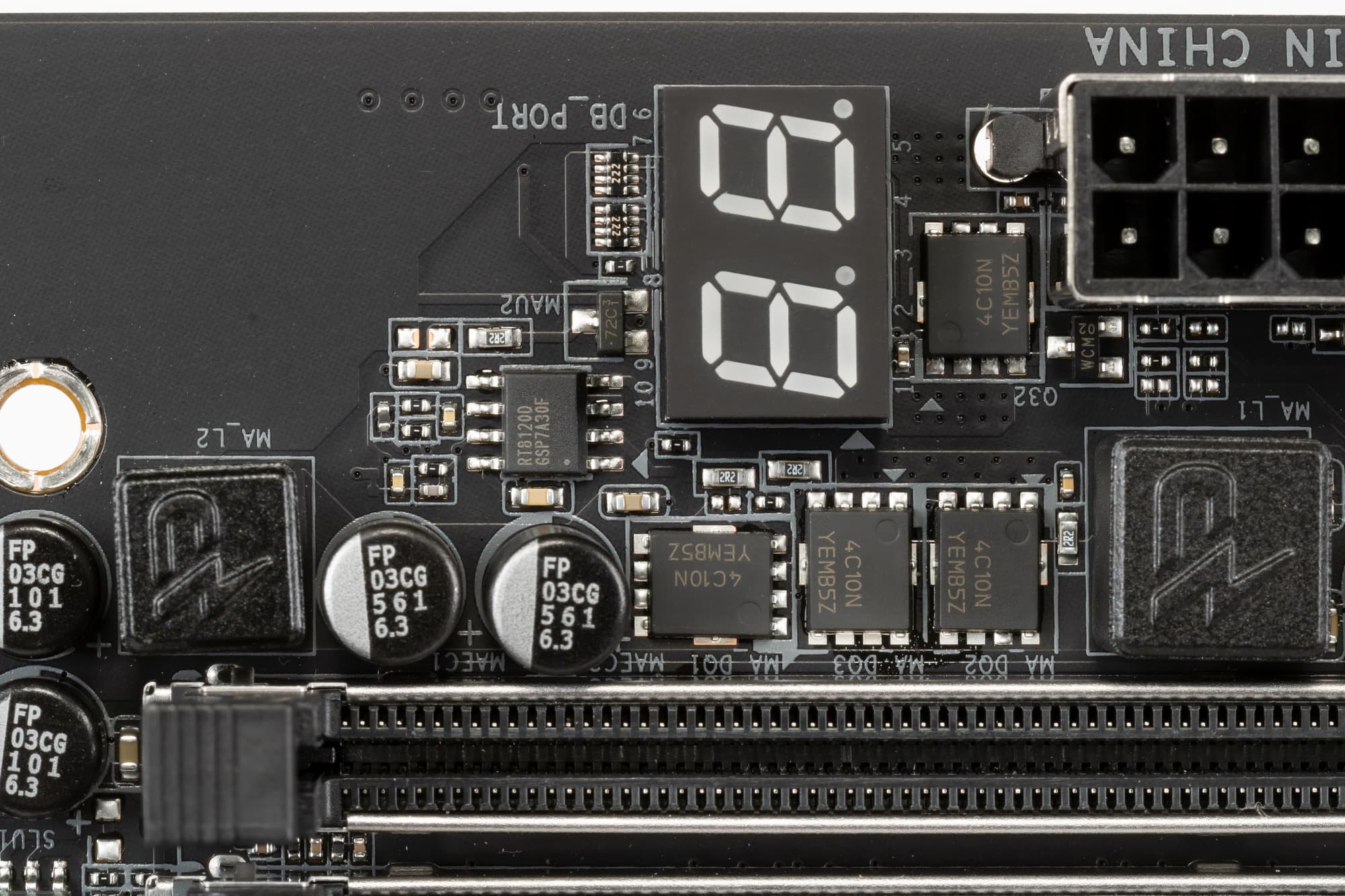 Что касается модулей оперативной памяти, то здесь все проще: реализована однофазная схема c контроллером RT8120 также Richtek. Тут же можем увидеть и табло POST-кодов (Debug codes).