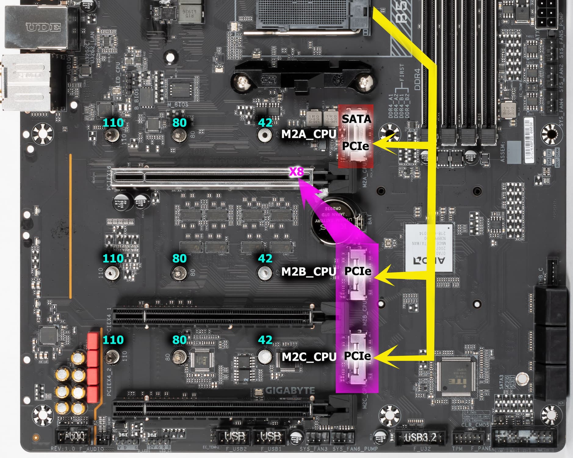 - Слот PCIe x16_1 имеет 8 линий, слоты M.2: M2B_CPU и M2C_CPU имеют по 4 линии (всего 8 линий)
