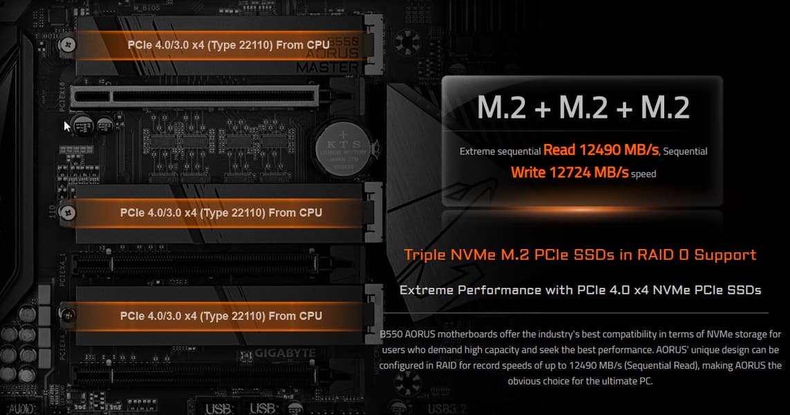 Процессоры Ryzen 3000 суммарно имеют 24 линии ввода-вывода (включая PCI-e 4.0). 4 линии (в данном случае превращаясь в PCI-e 3.0) идут на связь с чипсетом B550. Еще 16 линий — это PCI-e слоты для видеокарт. Осталось 4 линии: они могут конфигурироваться производителями материнских плат на выбор (либо-либо):
