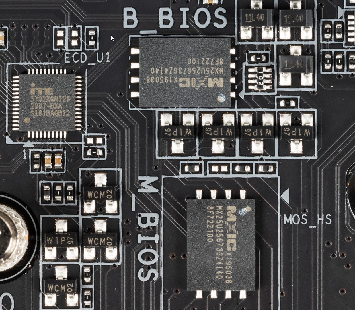Для размещения прошивки UEFI/BIOS использованы микросхемы MX25U25673G от Macronix. Плата имеет две копии BIOS, поэтому и микросхем две.