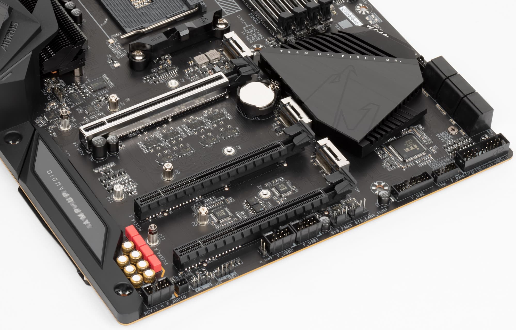 В нашем случае, хоть плата из семейства Aorus, но все же к флагманским ее отнести сложно: «фенечек» у нее мало, даже таких завсегдатаев по «прибамбасам», как кнопок питания и перезагрузки, здесь нет.
